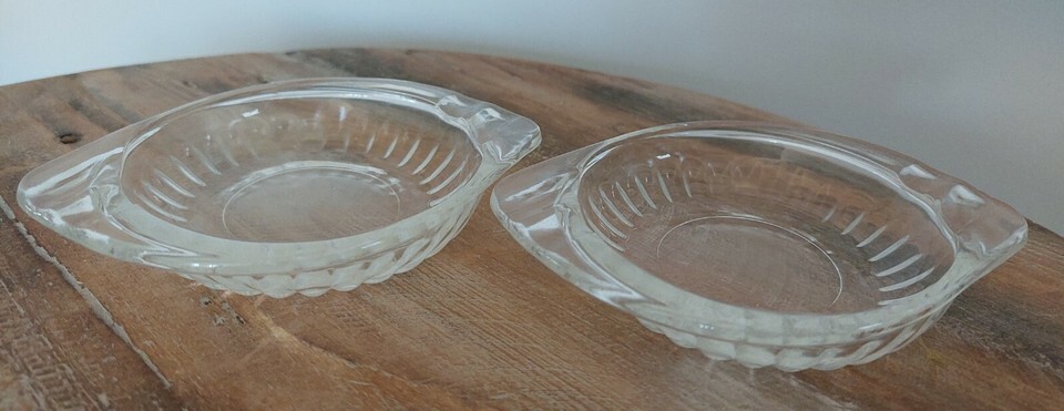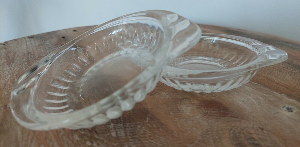 Each glass ashtray measures about 4 oe? across (the ?wing? sections on each side), by 1? in depth. No nicks, chips, cracks, or other flaws.