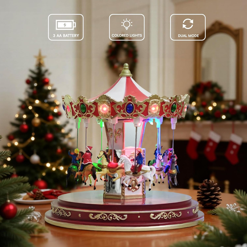 Bring festive charm to your home with this beautifully crafted Christmas Village Carousel Decoration. Standing 9.25" x 9.25" x 9.25", this delightful carousel features moving horses, multicolor LED lights, and classic Christmas music?perfect for creating a magical holiday atmosphere.