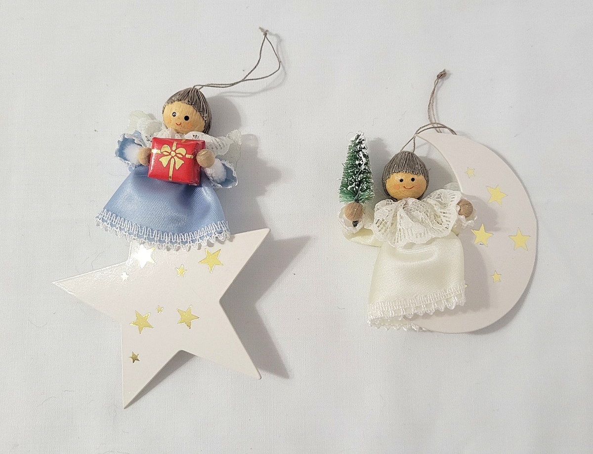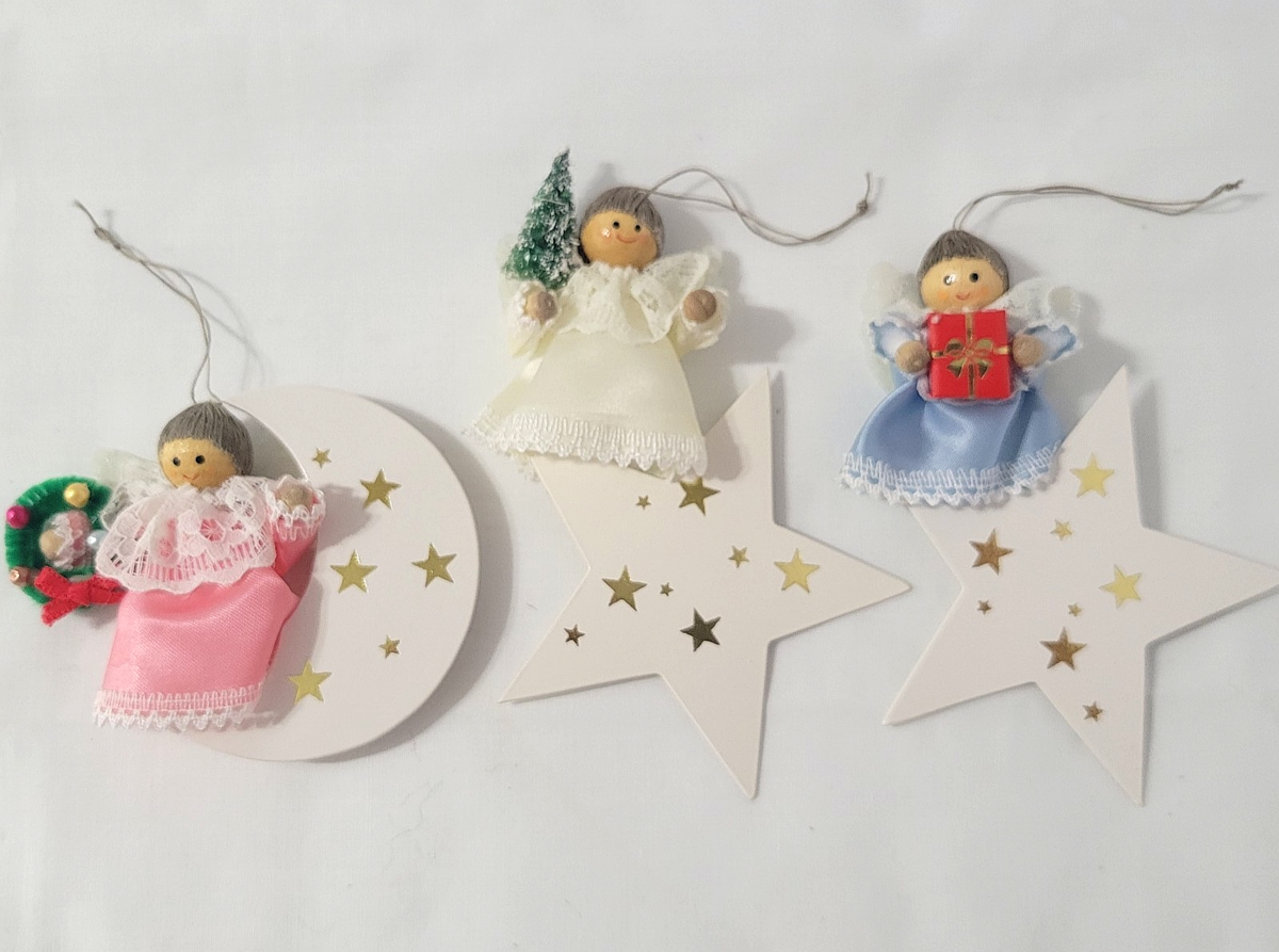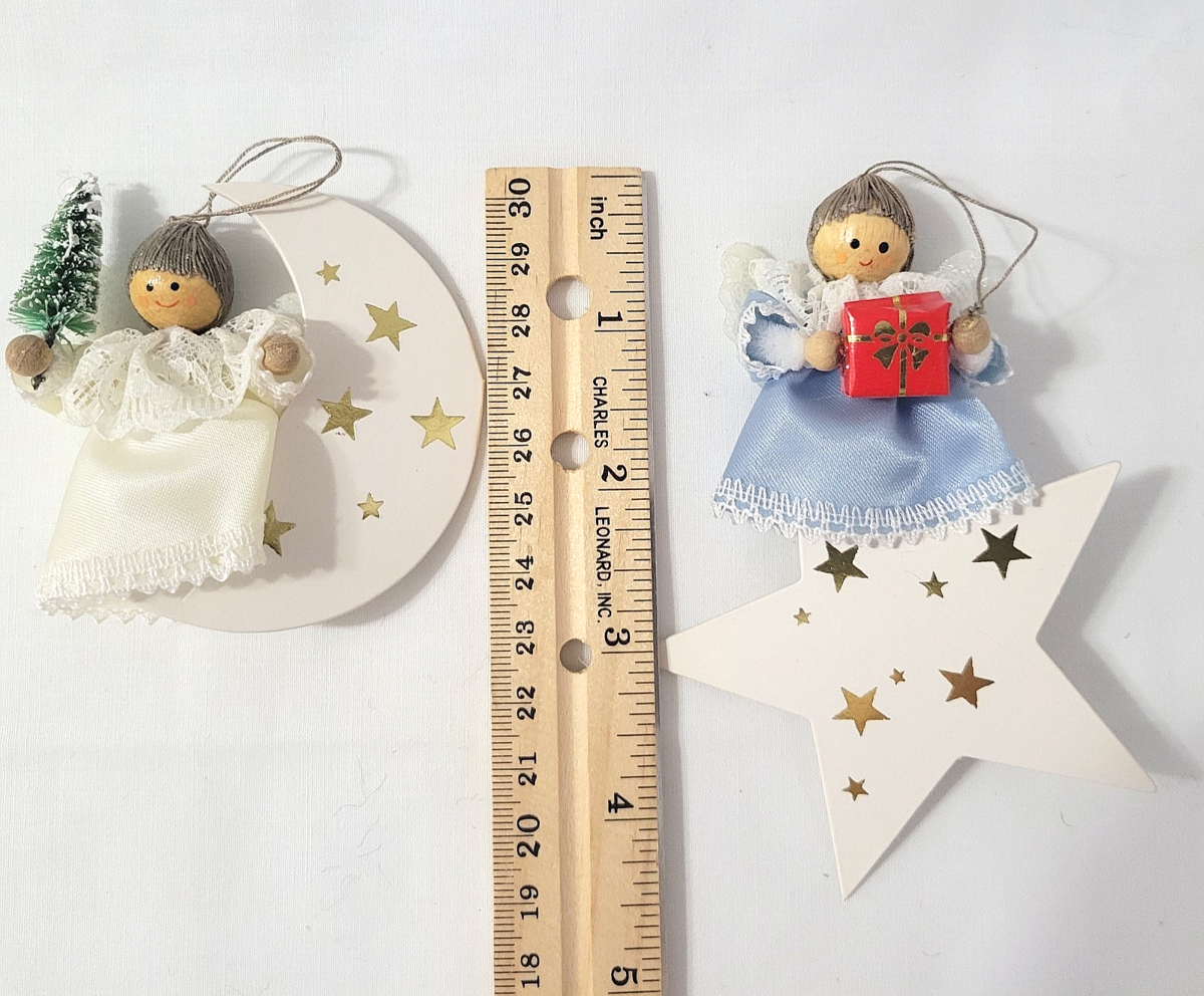 Great Lot of 5 harder-to-find ornaments -- each features a wood angel with satin/lace dress, attached to cardboard star or half-moon-- all have cords for hanging