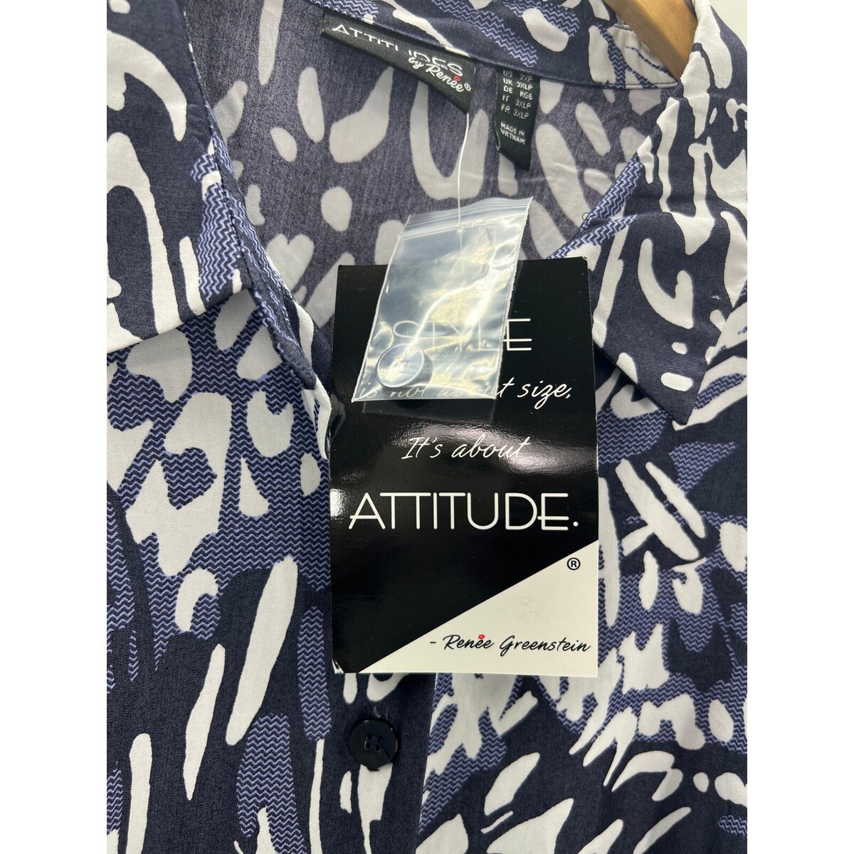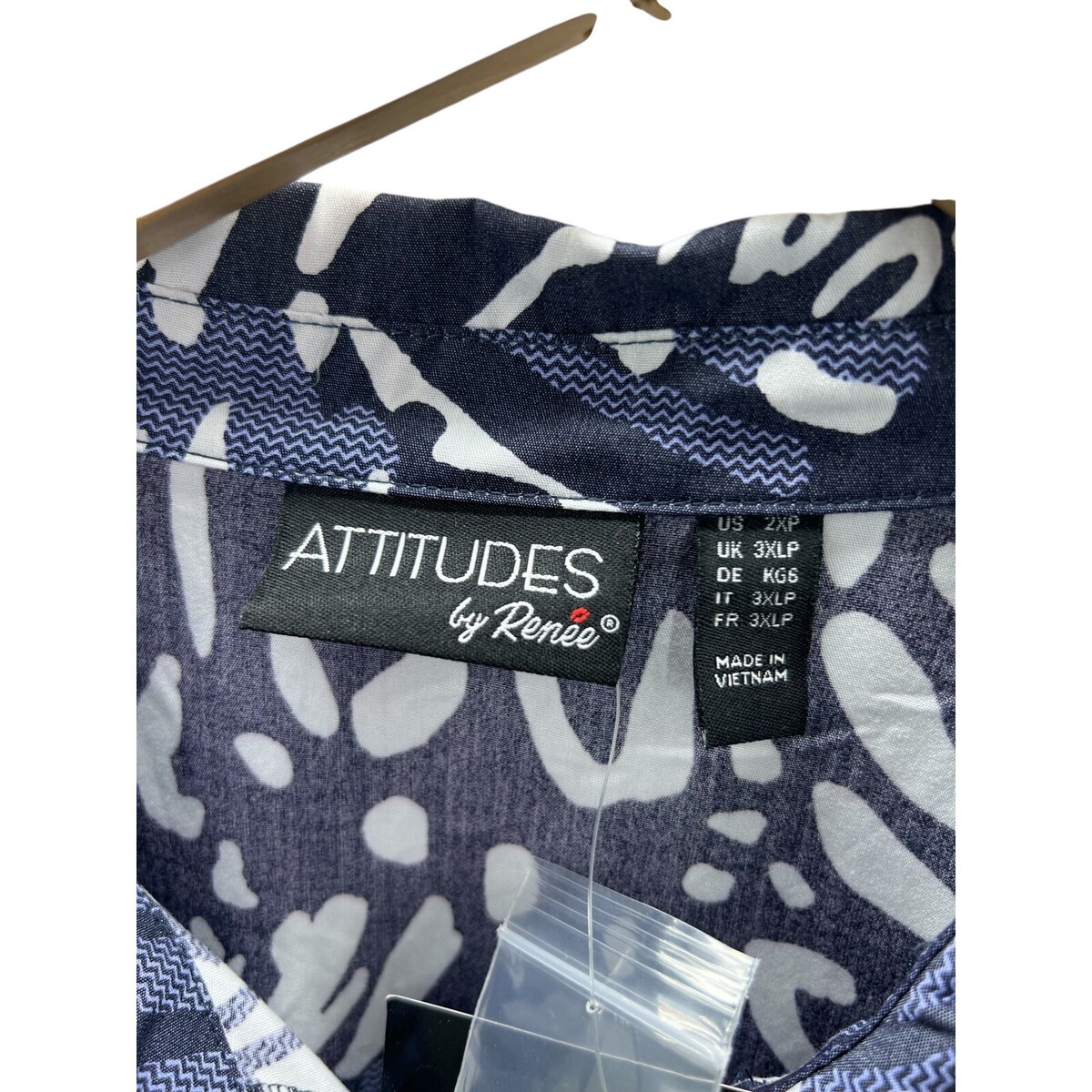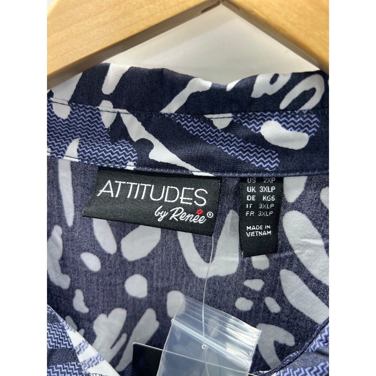 Keywords: Attitudes by Renee, shirt dress, button down dress, plus size dress, 2XP, dressy casual, long sleeve dress, abstract print, women's fashion, new with tags, work dress, day dress, navy dress, white dress, duster