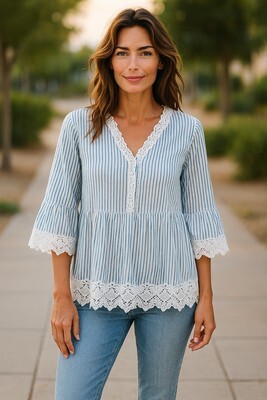 Keywords: Chelsea Theodore, Tunic Top, Blouse, Lace Trim, Striped, Bohemian, Boho, Plus Size, Womens Top, 2X, TTG, Three Quarter Sleeve, Casual Top, V Neck