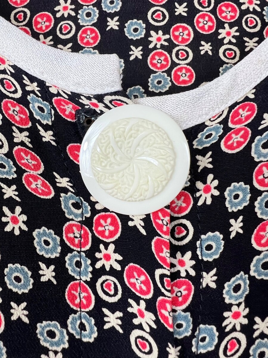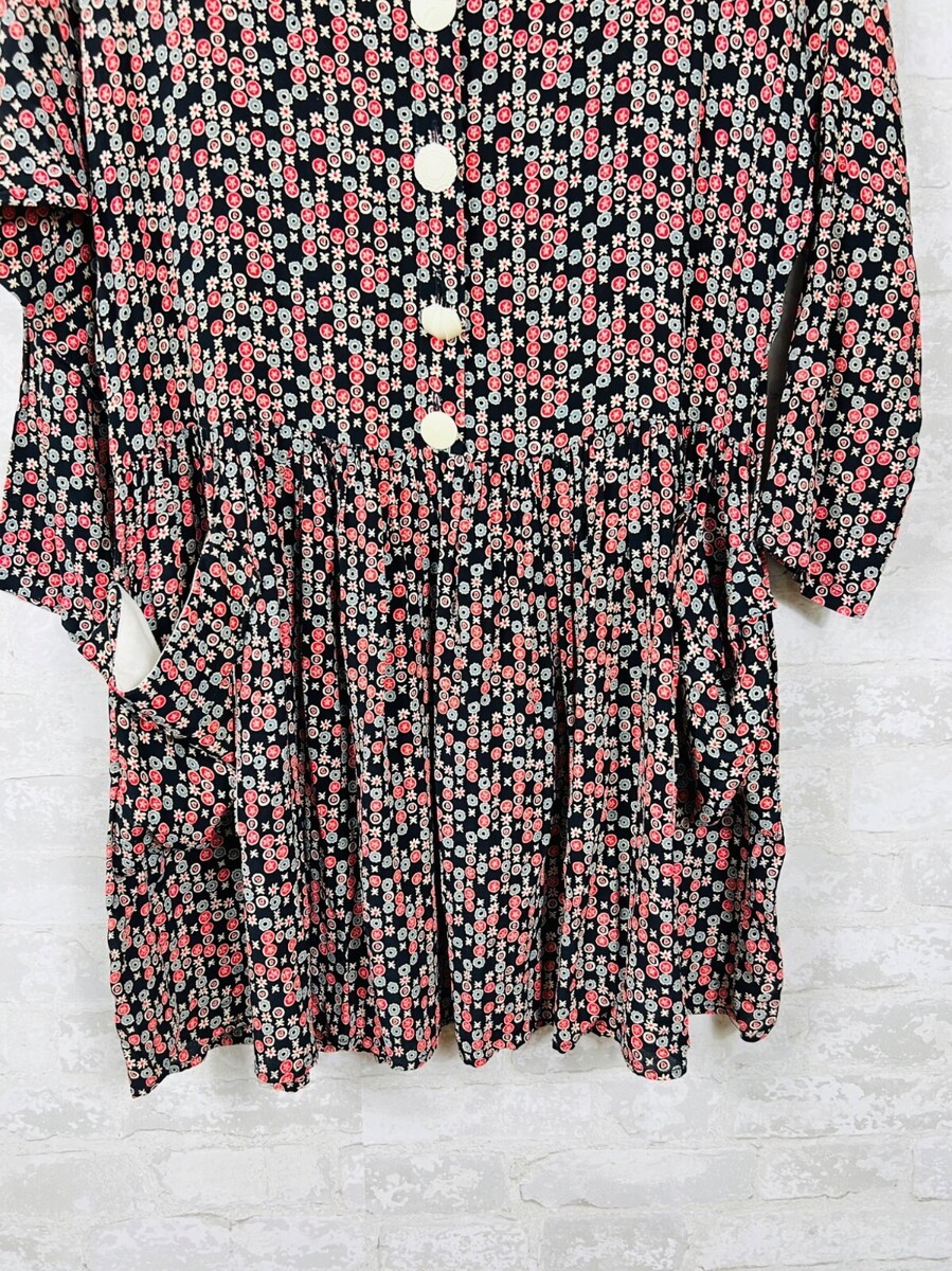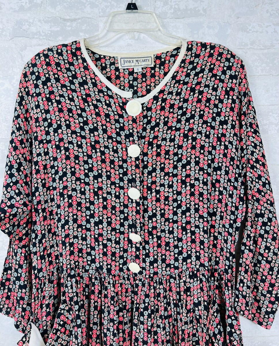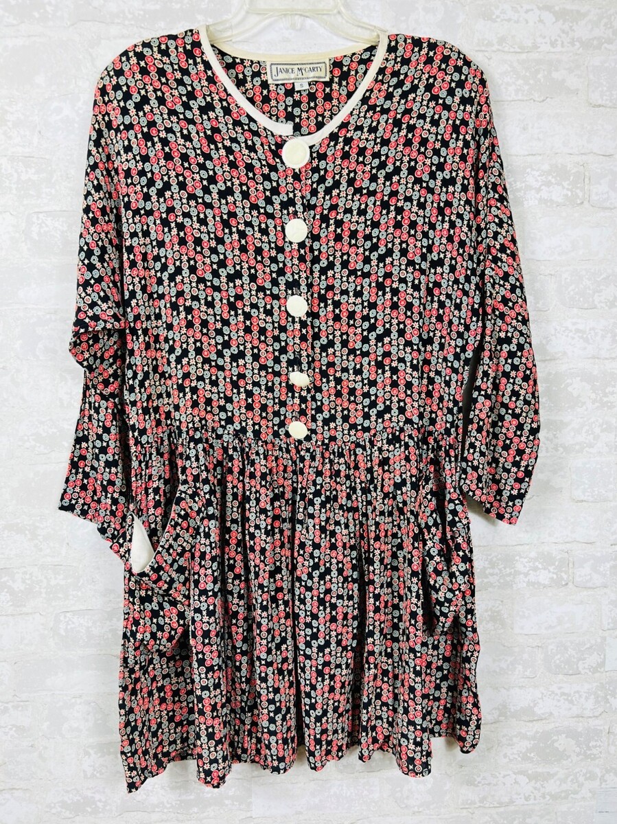 Vintage Janice McCarty Floral Button-Front Tunic Dress S Black Red White Pockets