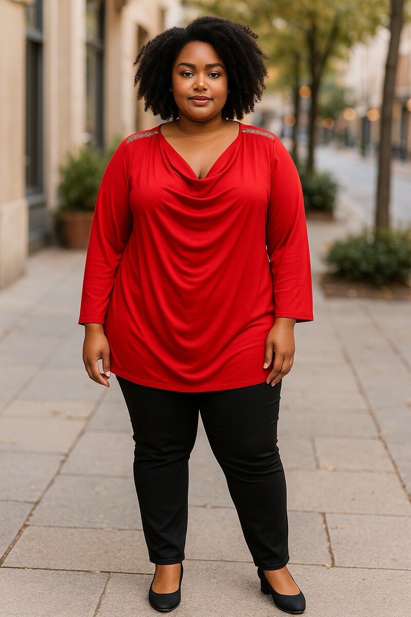 Keywords: Design History, Red Blouse, Cowl Neck Top, Embellished Shoulder, Plus Size Blouse, Womens Top, Party Top, Evening Wear, Holiday Top, 1X, Red Shirt, Draped Neck, Statement Top