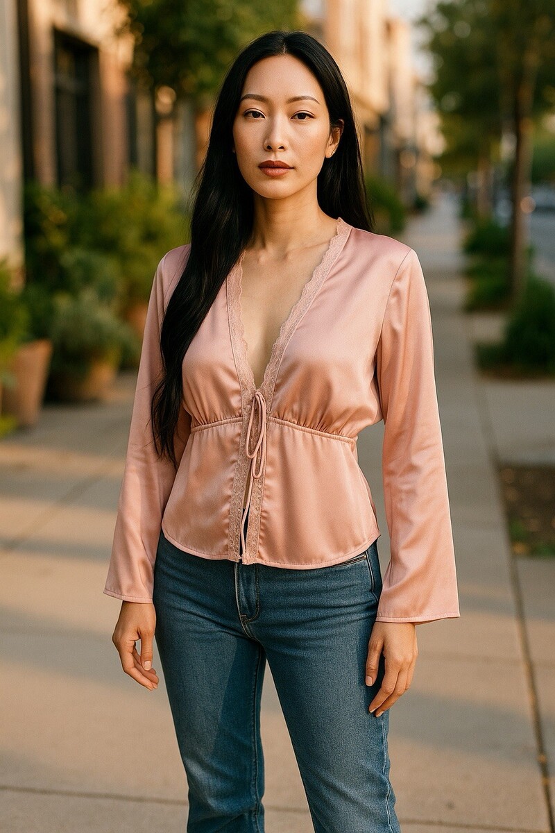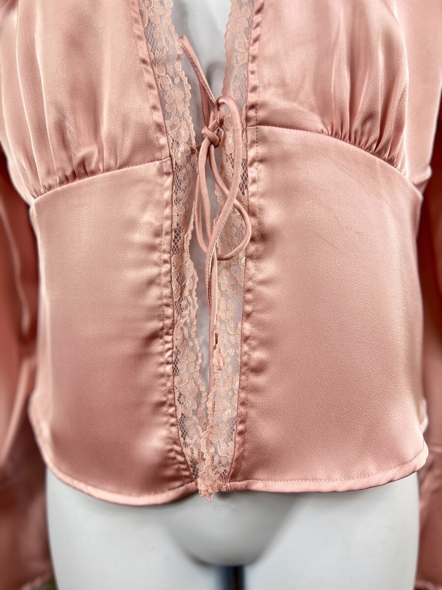 Whispers of romance emanate from this delicate pink blouse, a vision of soft femininity. The lace trim delicately frames the neckline, adding a touch of vintage charm, while the long sleeves cascade into subtle bell cuffs, creating a flowing silhouette. The cropped length adds a modern twist, making it perfect for pairing with high-waisted jeans or a skirt. Imagine yourself wearing this to a garden party, a romantic dinner, or a night out dancing with friends.