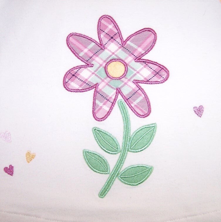 Long sleeve pale pink swing top has a big appliqued and embroidered flower on the front with little hearts embroidered in different colors around it. Contrasting pink plaid trim around neck and cuffs. Closes with three snaps at the shoulder.