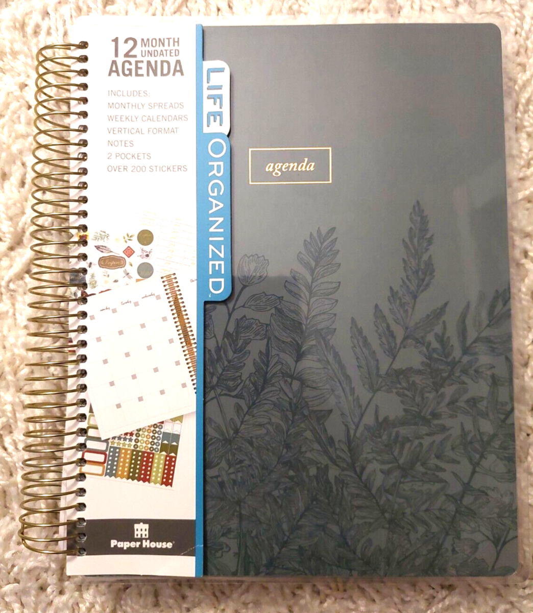 This is a new undated 12 month agenda from Paper House that includes monthly spreads, weekly calendars with vertical days - one week on two pages, notes, 2 pockets and over 200 stickers. Start any day of any year. Quality white papers. The journal measures just under 10? in height by 8 oe? in width and just under 1? in depth. New from a smoke-free home.