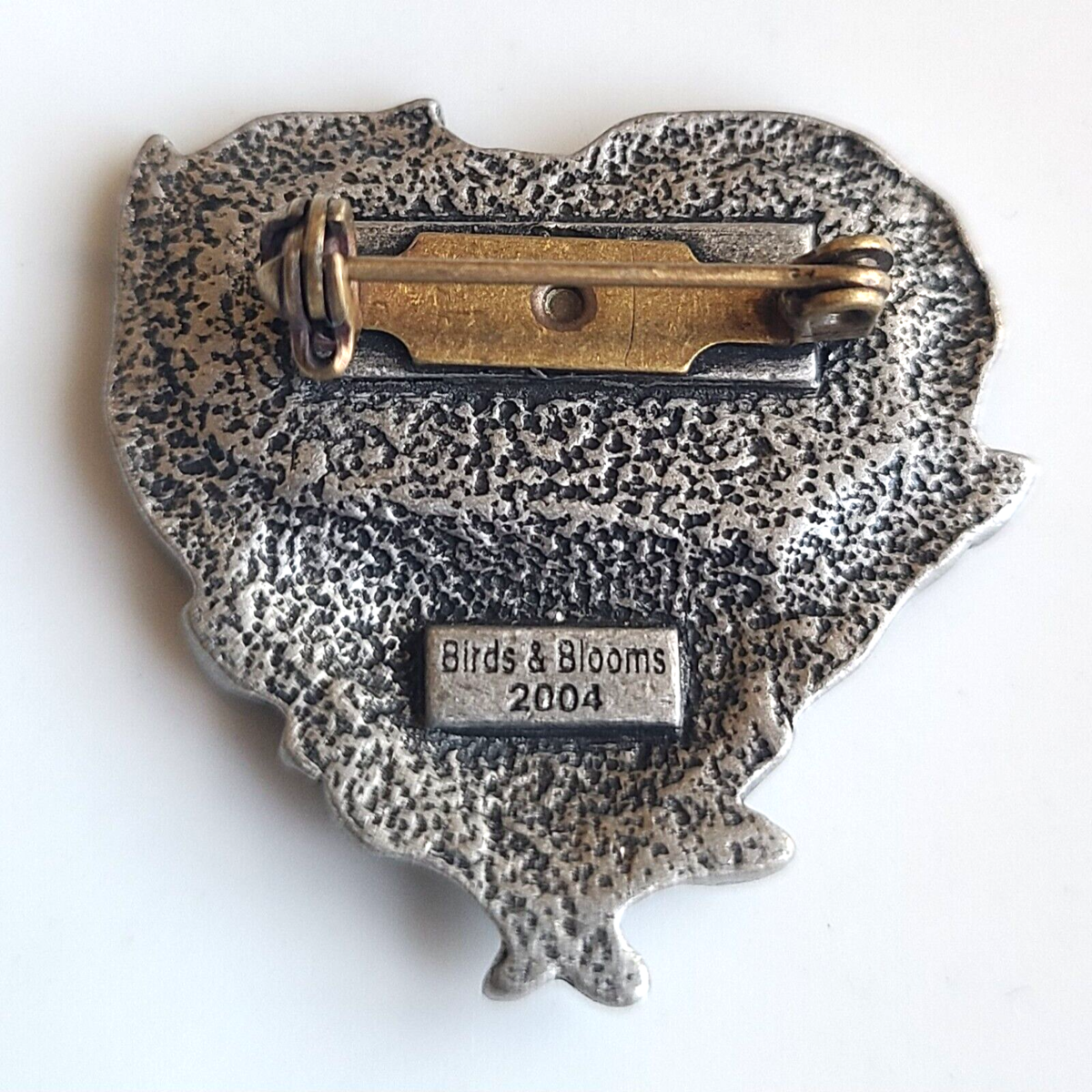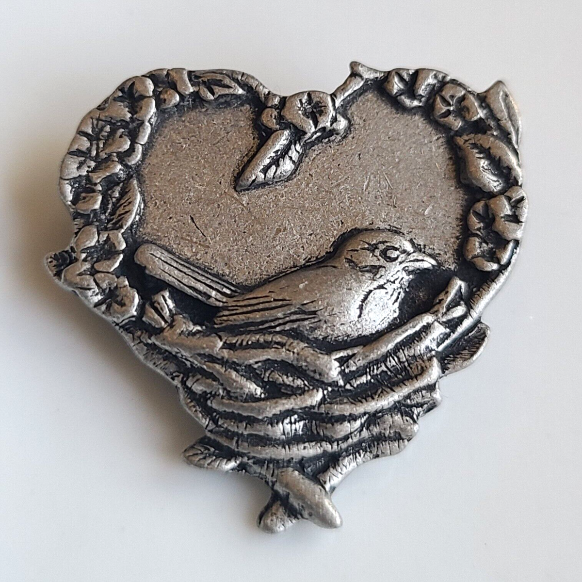 Vintage Birds & Blooms Pewter Bird In Nest Heart Shaped Lapel Pin Brooch 2004