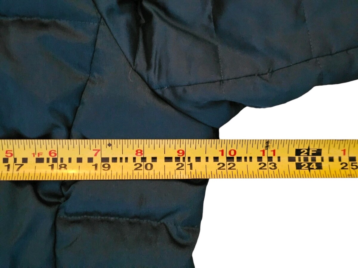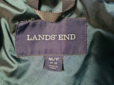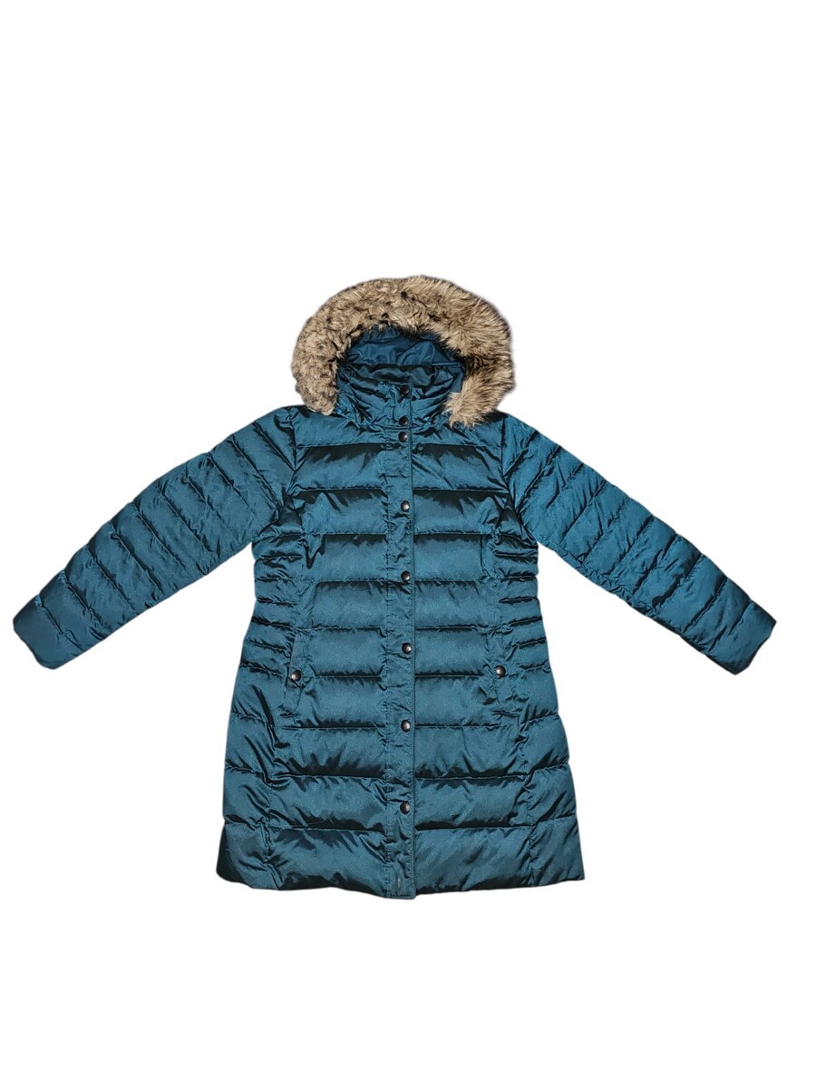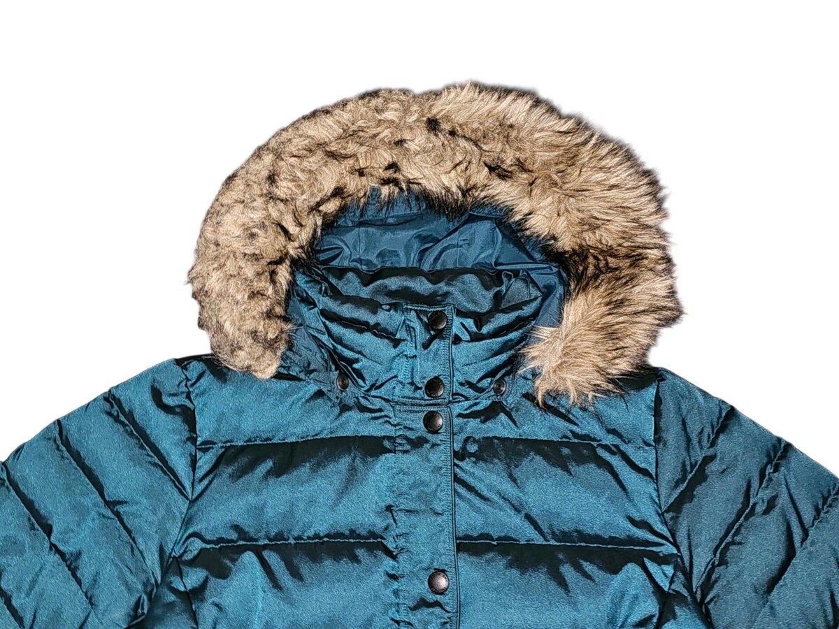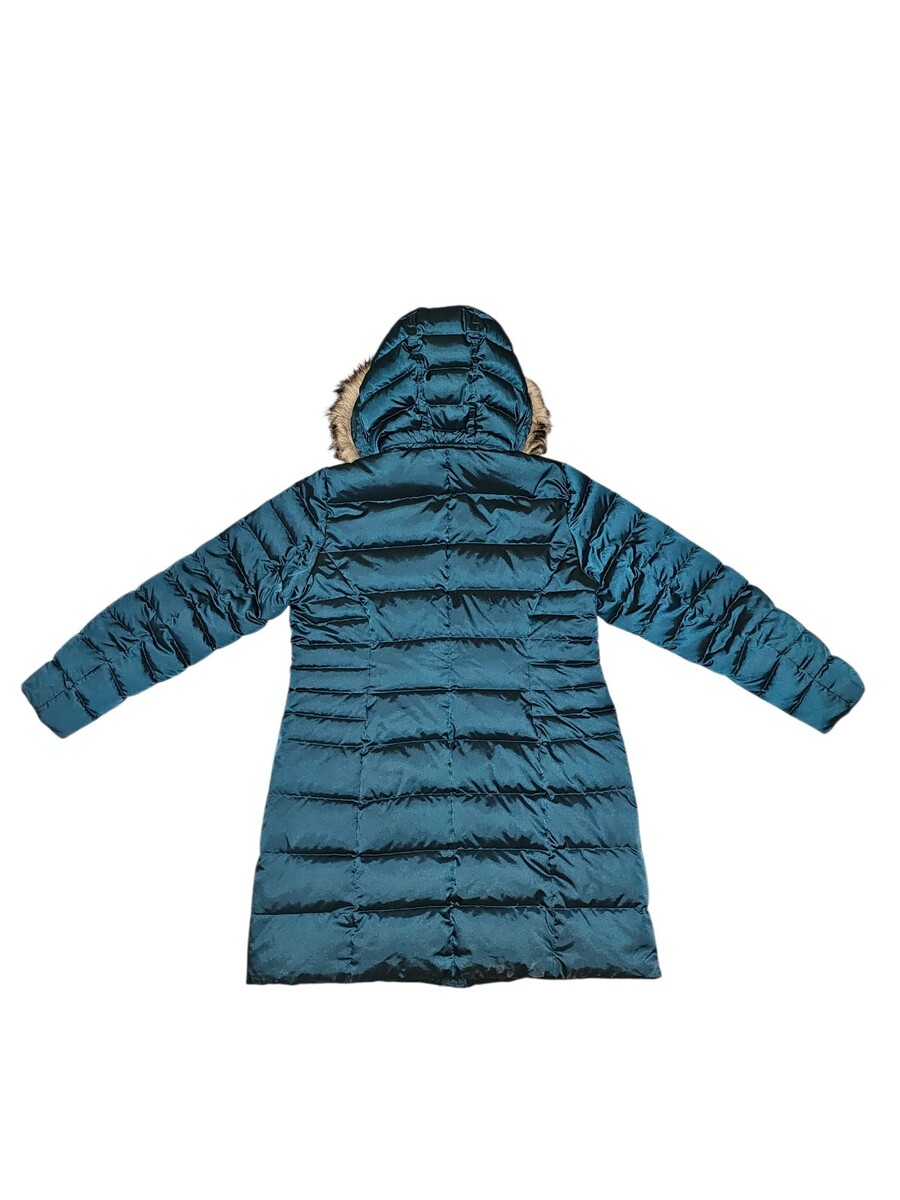 Lands' End Down Puffer Coat with Faux Fur Hood in satin Evening Teal Women's M