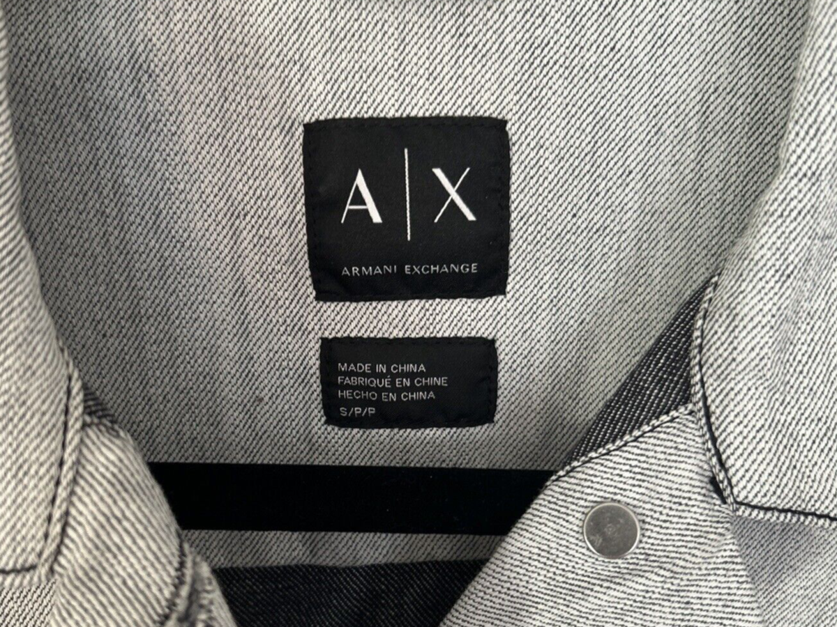 This is a women's Armani Exchange denim jean jacket in size Small. It is made of 100% cotton with a light gray color. The jacket features a full zip closure, long sleeves with zippered cuffs, a spread collar, and a curved hem. It is designed in a mid-length style with a regular fit, suitable for casual occasions. Machine washable for easy care.
