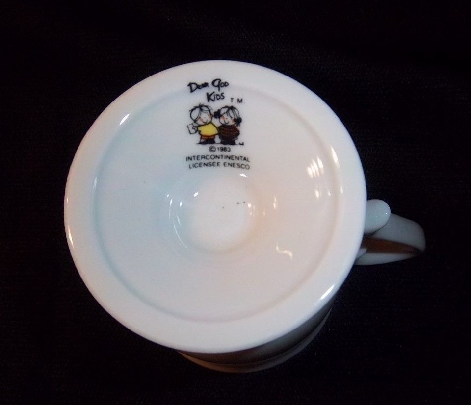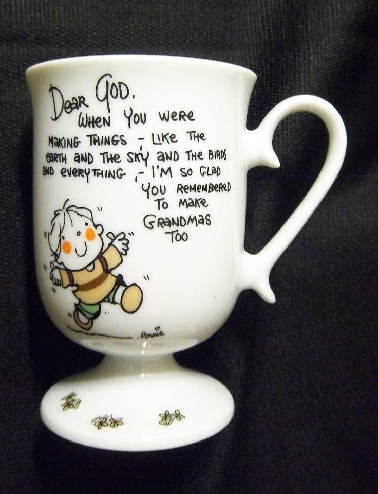 Adorable and Charming, this Dear God Kids mug dates from 1983 and is such a wonderful tribute to Grandma -- please see photos to read entire inscription! Lovely design, bright colors, this looks never used. Total height of mug is 4-1/2" high.