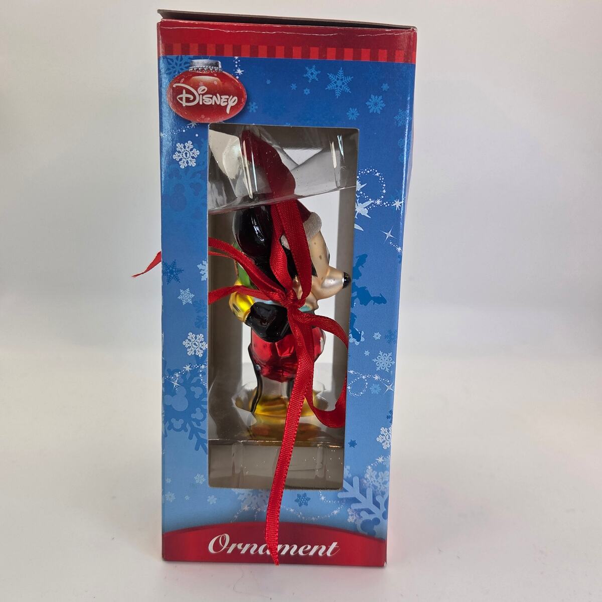 This Disney ornament features Mickey Mouse dressed in a Santa hat and holiday outfit, holding a stack of colorful gifts. The ornament has a glass-like finish with a festive design, making it perfect for any Disney or Mickey collector. It appears unused and comes with the original retail box, which shows some shelf wear. A charming piece for holiday decorating or gifting.