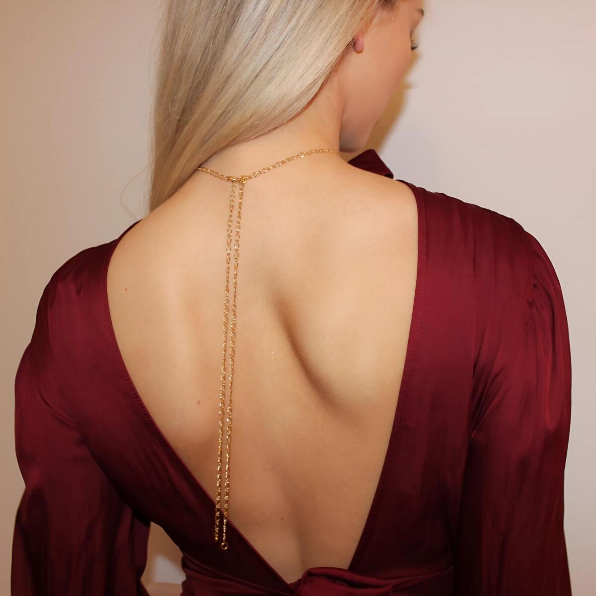 This handcrafted gold-filled bridal back chain is designed to bring a touch of refined luxury to open-back wedding gowns and elegant special occasion looks. Made from premium 2mm gold-filled cable chain, the piece wraps softly around the neck while two identical strands cascade down the back in a perfectly balanced 38-inch drop. The result is a clean, luminous line that enhances the silhouette from mid- to lower back.