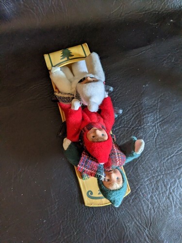 Up for sale is a used Byers Choice 3 Three Toddlers on Wood Toboggan Sled in Red, Green, and White Snow Suit.