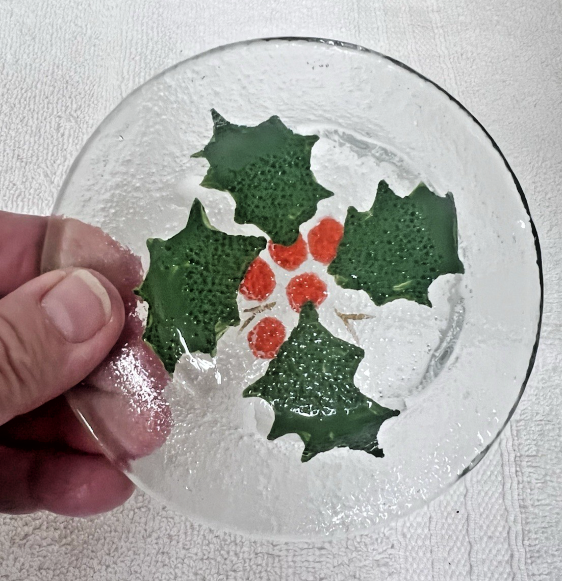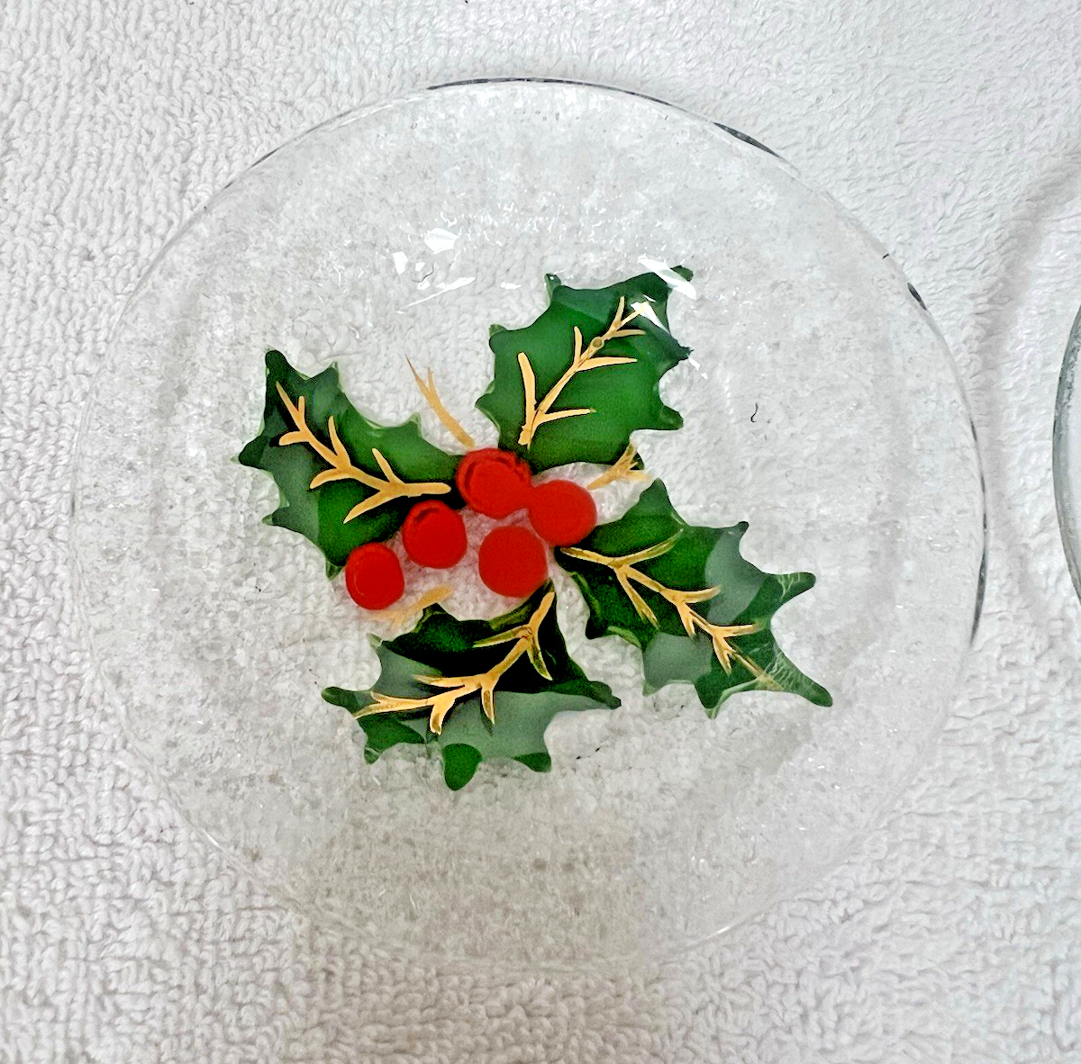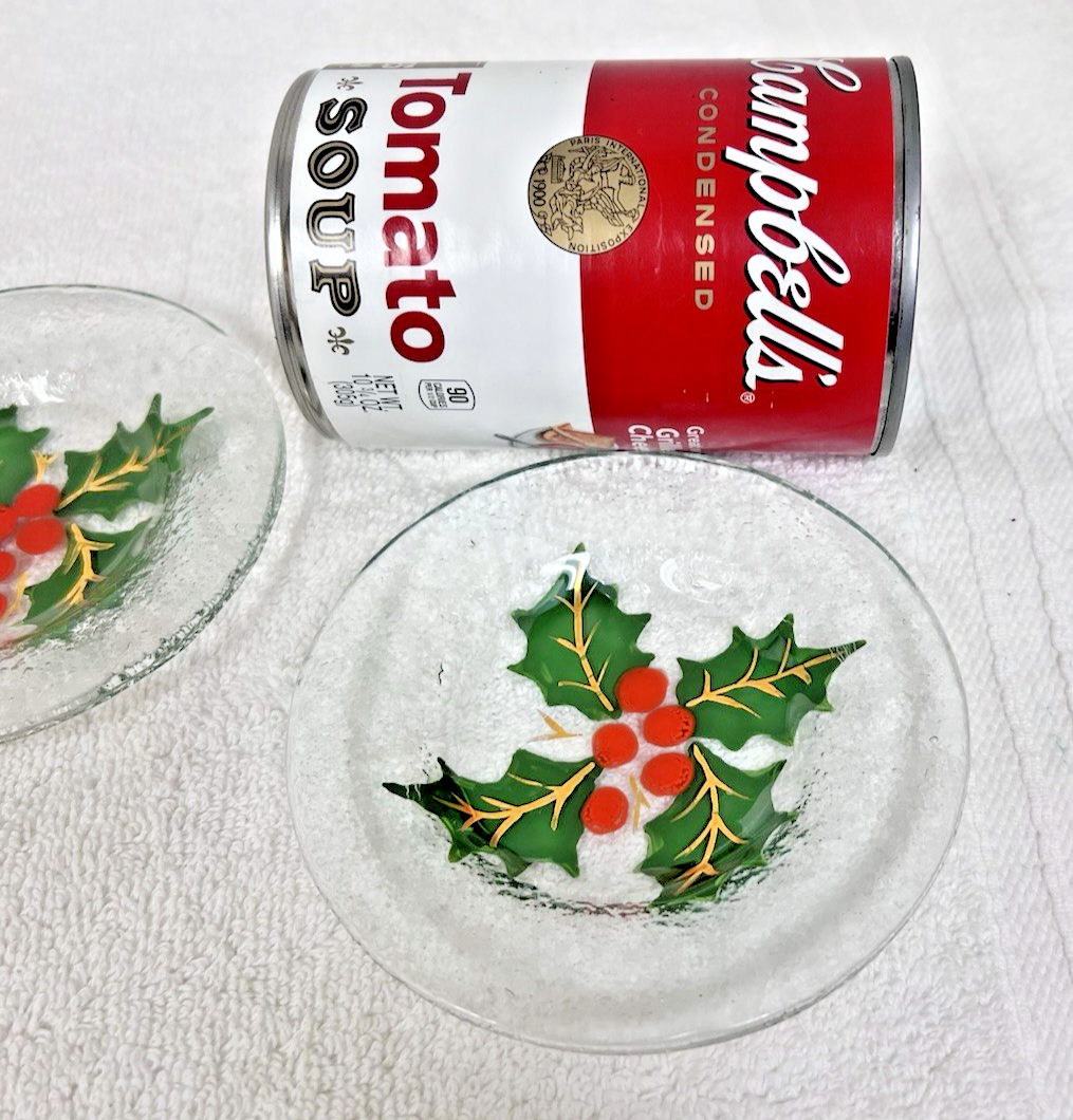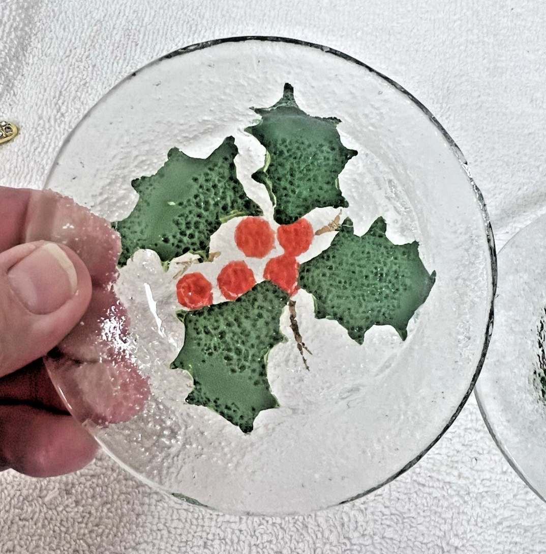 2 Christmas Holly Berry Fused Glass Mini Plate Coaster Set 4" Great Shape Both are chips free and in good shape