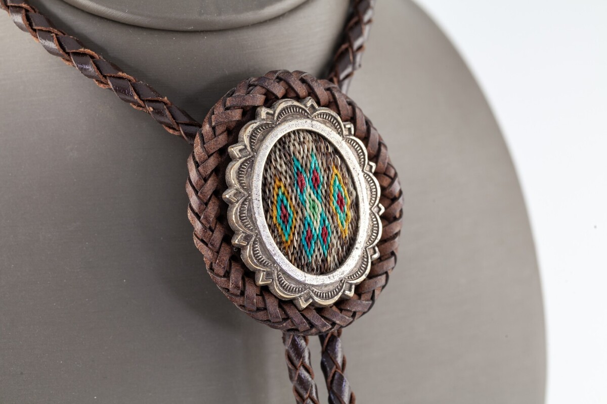 Cravatta Bolo intrecciata in pelle intrecciata unica con castone e puntali in argento