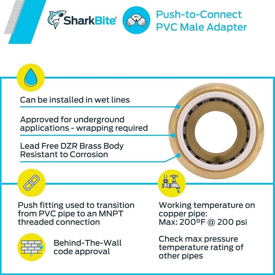 The SharkBite (r) PVC x MNPT adapter allows you to make a joint to Schedule 40, 80 or 120 PVC pipe using a push-fit connection and gives you a male NPT adapter on the opposite end. Use to transition from iron pipe size PVC pipe to copper tube size copper, PEX, or CPVC, or PE-R