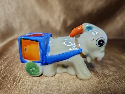 3 Vintage 1940s Porcelain Figurines Hand Painted Japan Donkey Pin Cushion Women