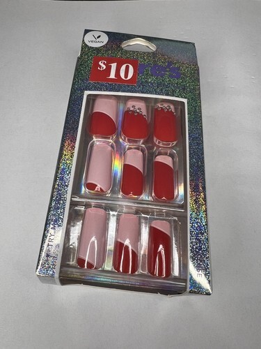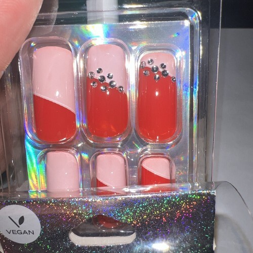 24pc Claire's Fake False Press On Nails Glue On Vegan Red Pink Rhinestone Square