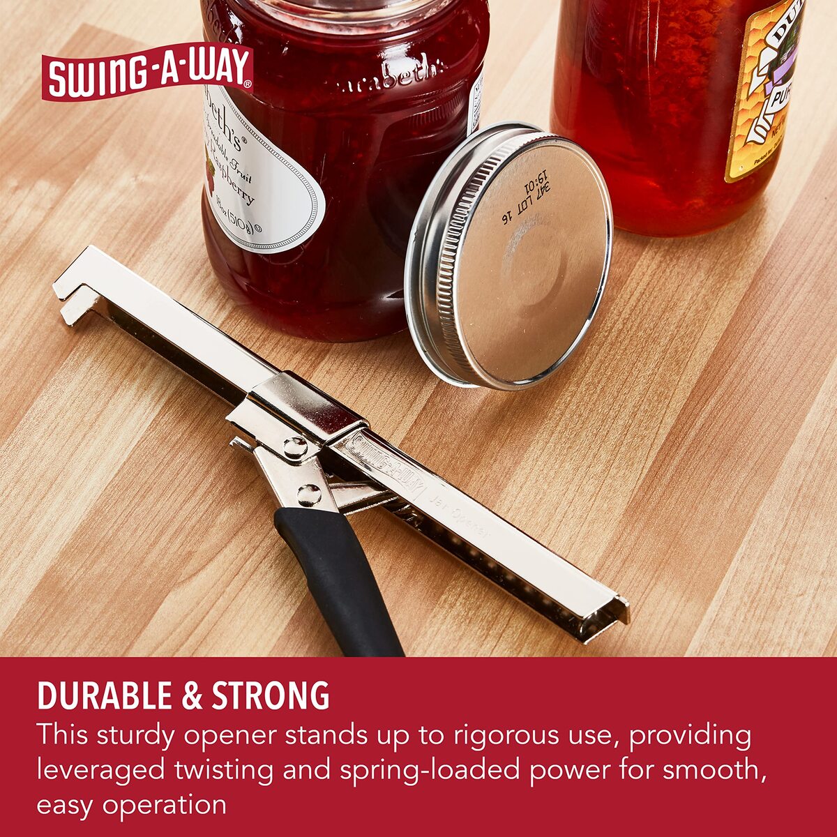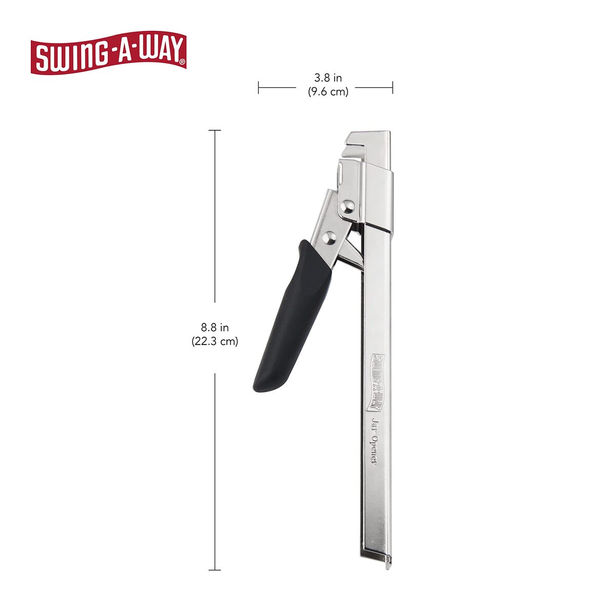Product description: Since 1938, Swing A Way has created the highest quality, most dependable can openers on the market. When you reach for a Swing A Way, you reach for a classic. Soon to become one of your go to kitchen gadgets, this Comfort Grip Jar Opener is a must have! Easily open stubborn jars lids and caps with leveraged twisting and spring-loaded power for smooth, easy operation. This opener adjusts to fit most food lids, jar lids and more. Extremely durable with an all-steel construction. Designed with you in mind this opener features an ergonomic, soft cushion grip for comfortable handling; will fit any size hands large or small. This jar opener is perfect for anyone young or old but ideal for arthritis, grandparents, and seniors. Take the stress and strain off your hands by providing leverage twisting and spring-loaded power for smooth opening. Our openers feature smooth-operation mechanisms and comfortable handles that provide an optimal, pain free experience when using. Hand wash when needed with warm water and a mild detergent, rinse and dry immediately. Measures 7.5 inches.