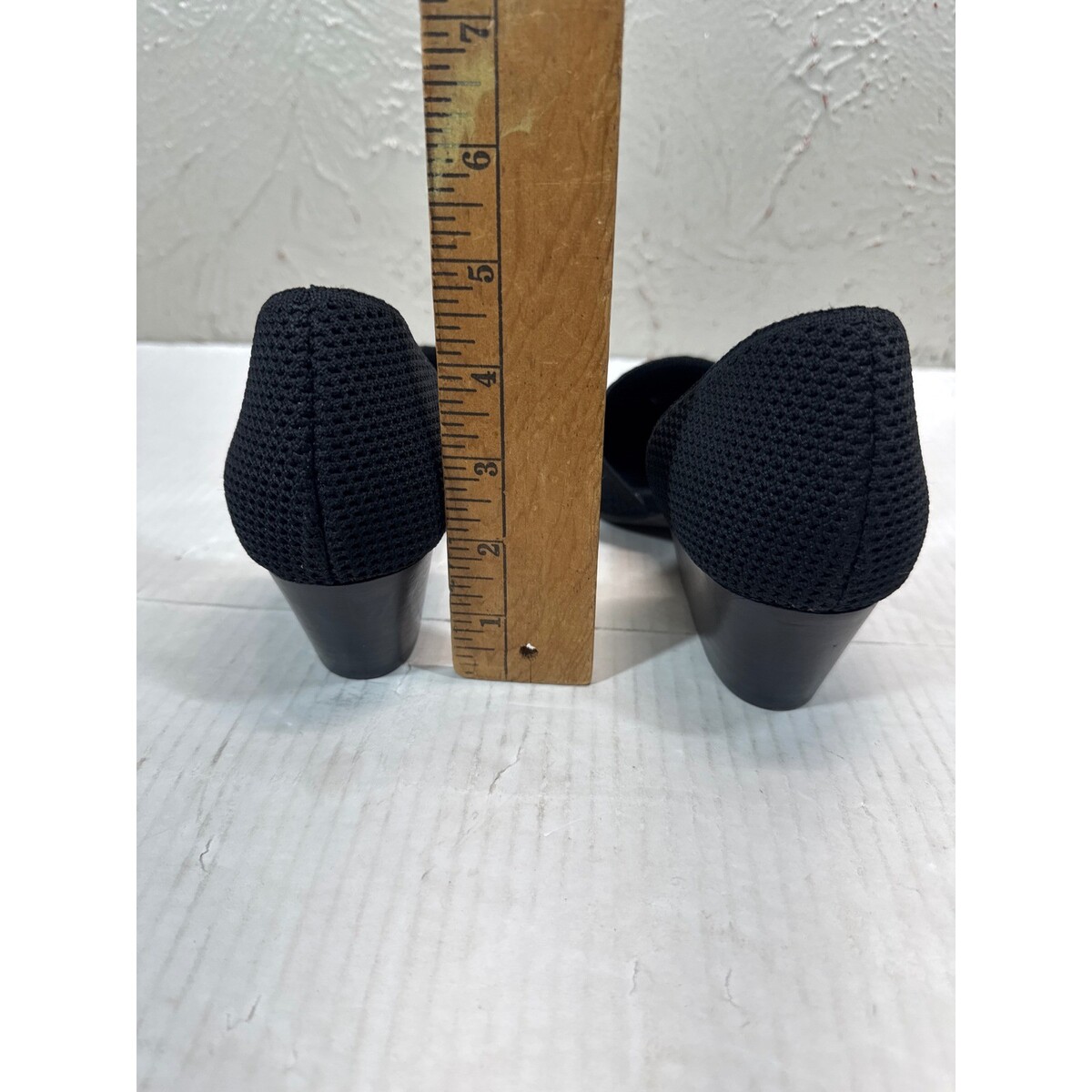 Eileen Fisher black mesh d'Orsay pointed toe flats. These stylish and comfortable flats feature a breathable mesh construction and a classic d'Orsay silhouette with a flattering pointed toe. The low heel provides a touch of lift without sacrificing comfort, making them perfect for all-day wear. Ideal for casual outings, office wear, or travel.