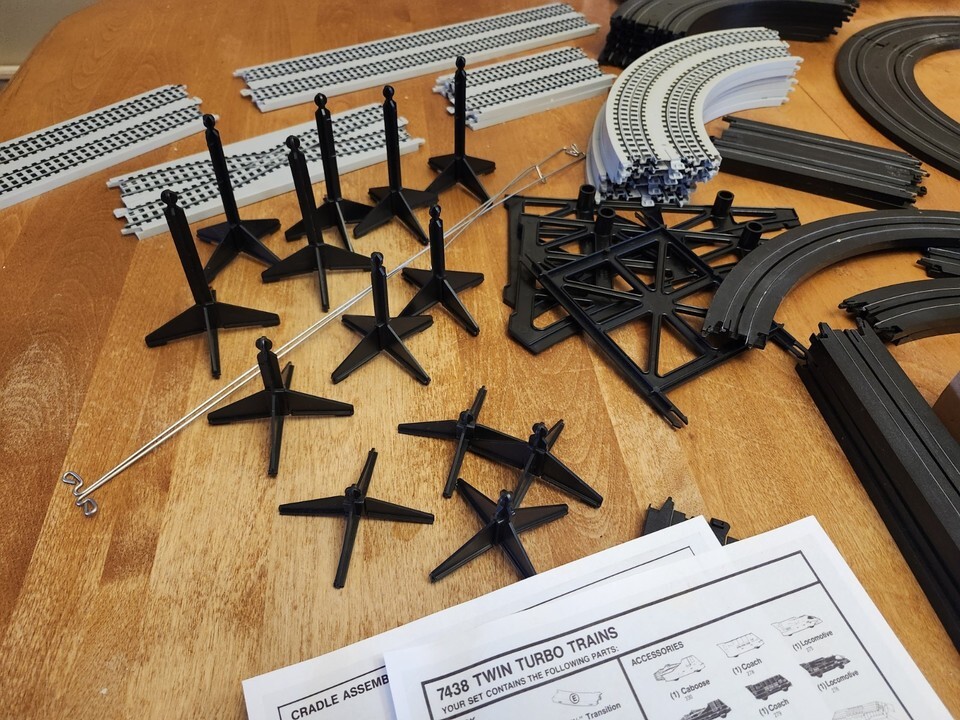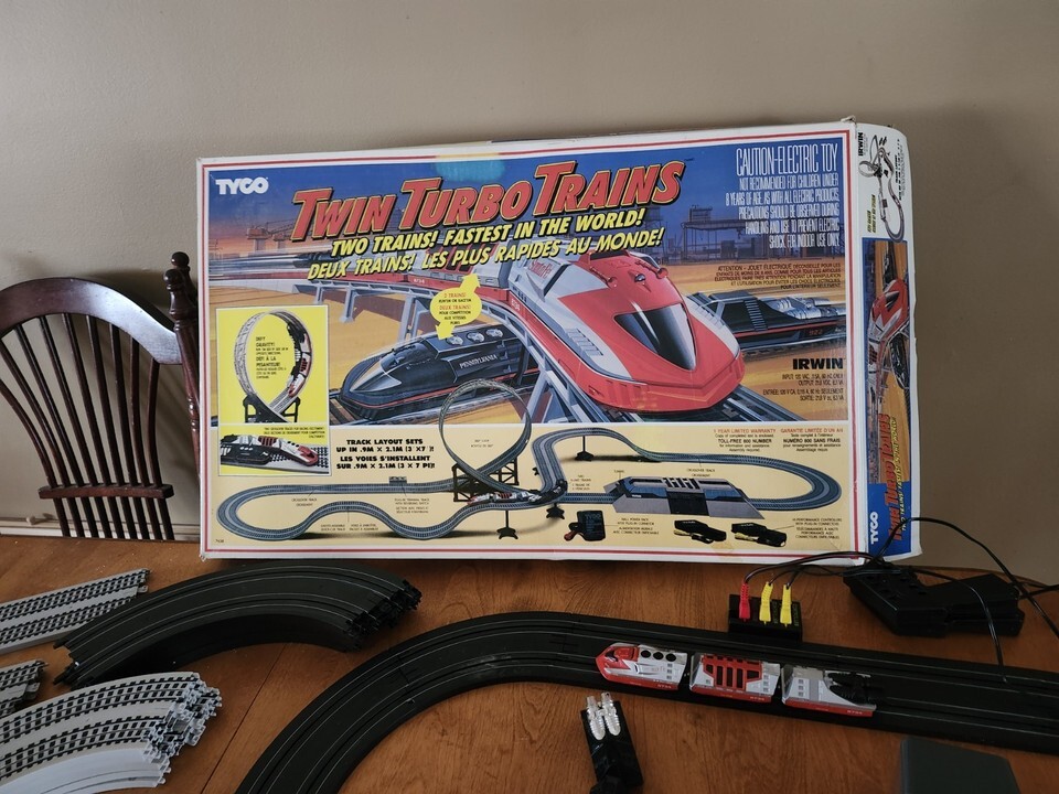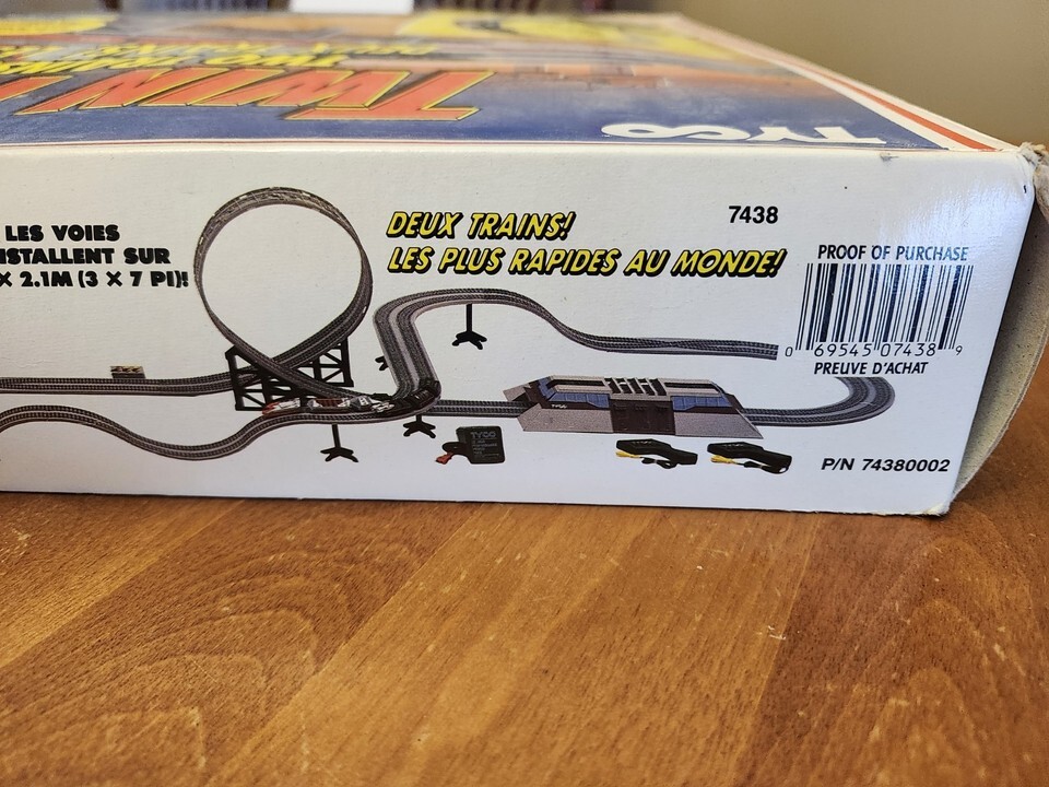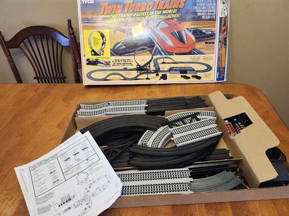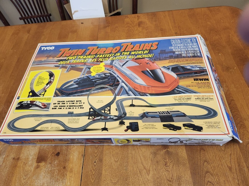 For immediate purchase is this Vintage TYCO Turbo Twin Train Set with Extras in Box 1989. This set includes all original parts EXCEPT for the tunnel but it includes several duplicates including Power Adapter, 2 extra controllers and an extra terminal Please check photos carefully. Shipping will calculate automatically based on your location.