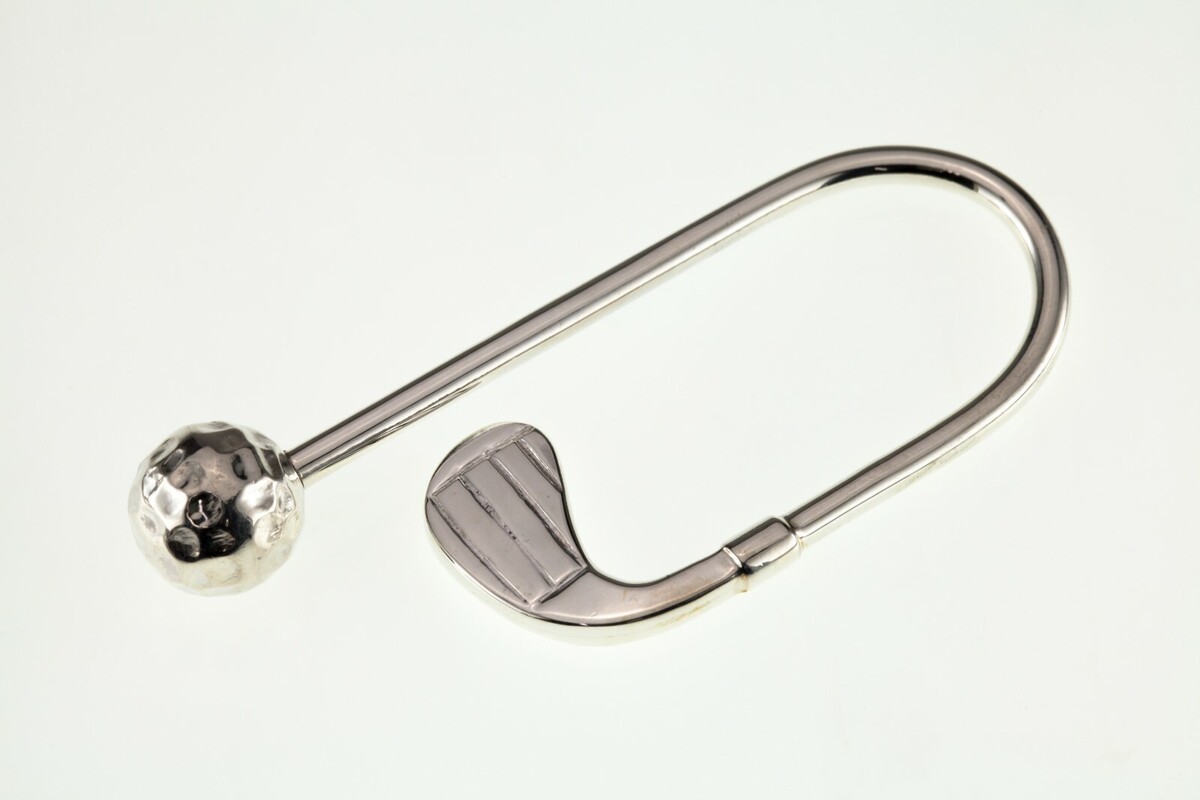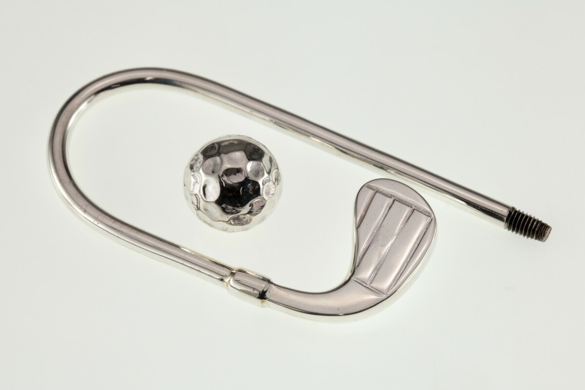 Hermoso anillo de llave de plata esterlina con un club de golf curvo con una pelota de golf extraíble al final.