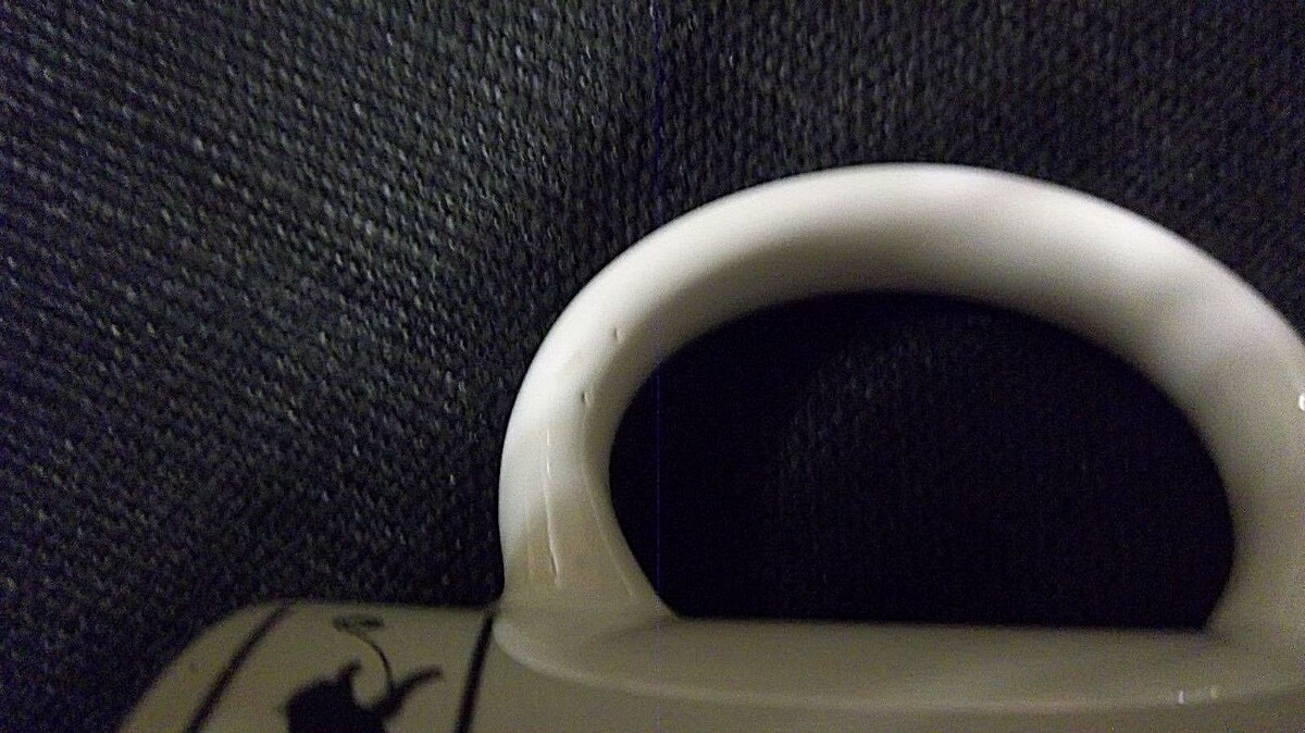 No utensil marks, no chips, there are 2 manufacturing blems: pinholes/pits on one handle (see last photo), and 1/16" of border line on other mug is marred