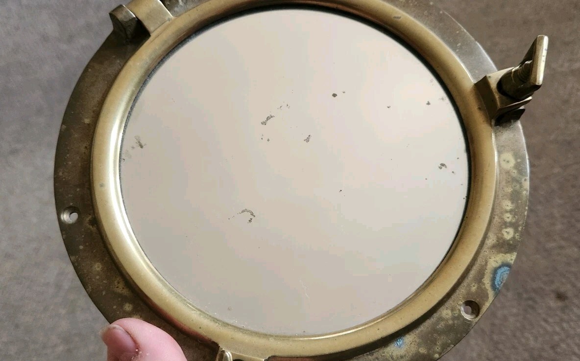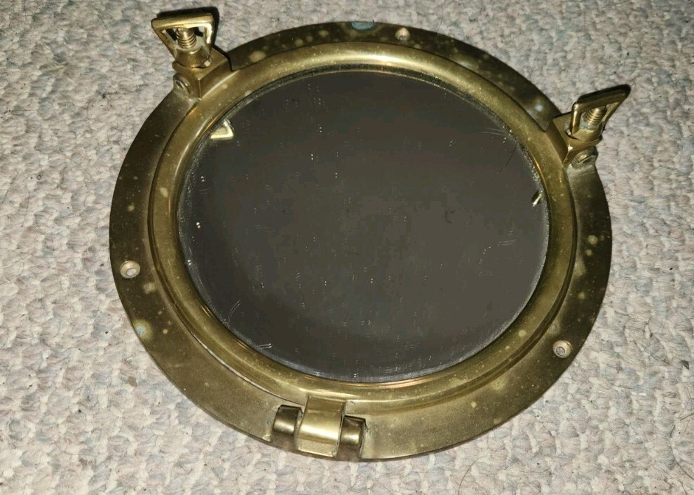 Total width of this is 8 inches. Has some tarnish to the brass. Might polish up fine. Some marks to the mirror. Made by Penco. Classic nautical ship decor. Porthole look. Has 2 screws that open to let the mirror hinge.