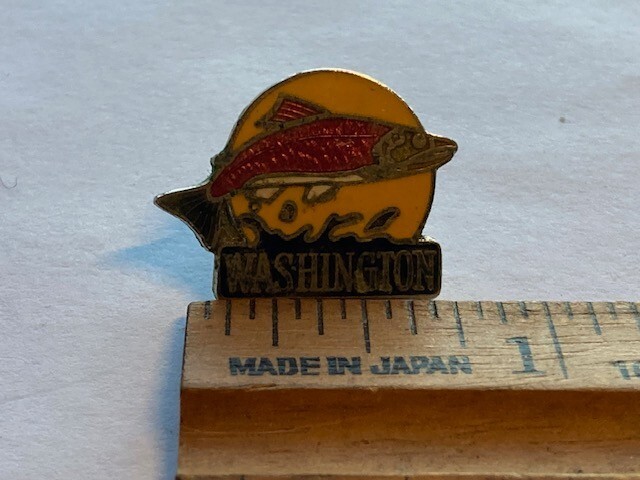 Vintage Washington State Enameled Hat/Lapel Pin Jumping Salmon Sun Water Collectible. Front very good, some tarnish on back per images. Please refer to images.
