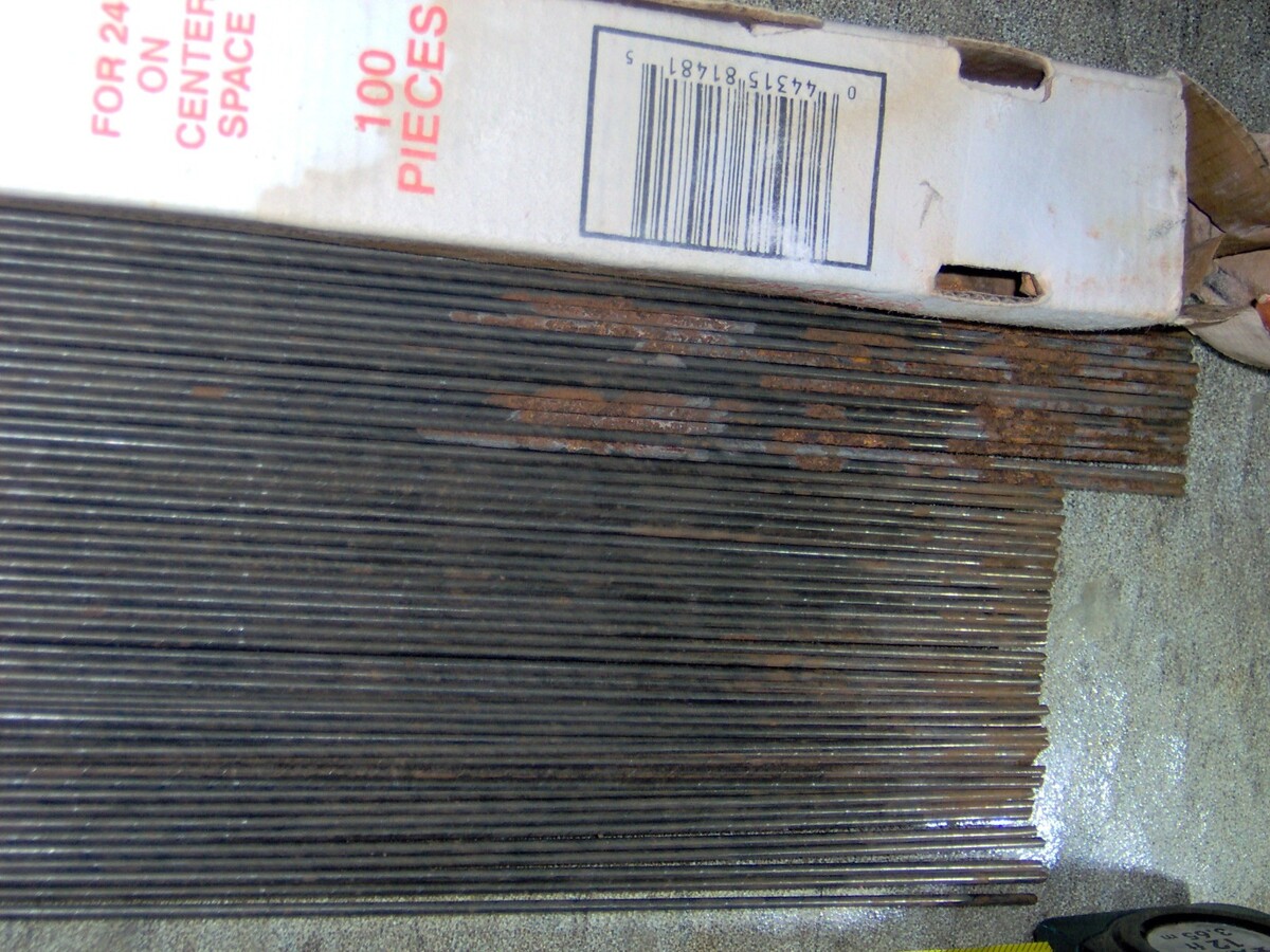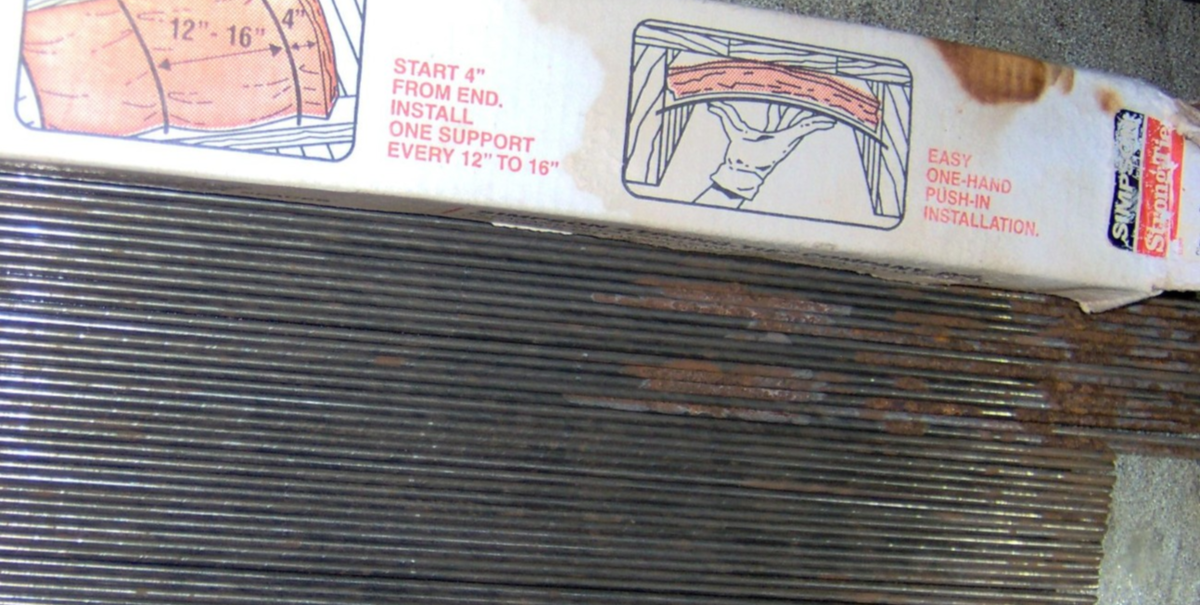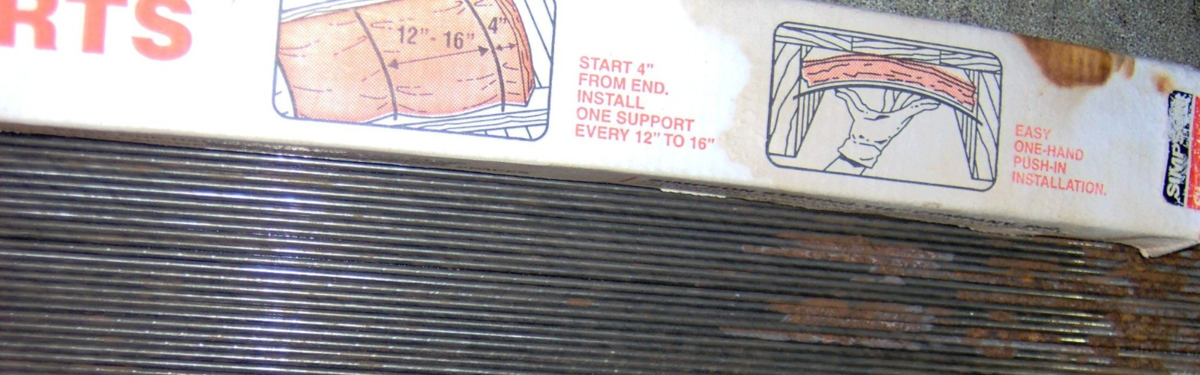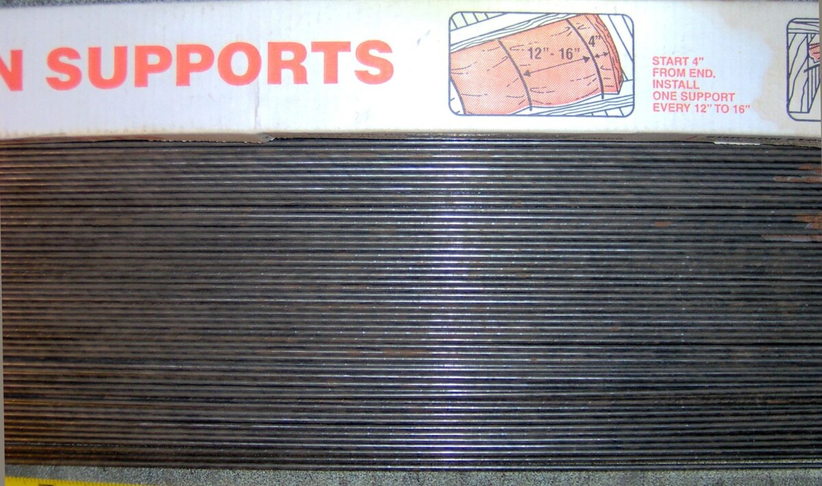 (1) BOX OF 23.5 inch INSULATION SUPPORTS BY SIMPSON STRONGTIE UPC# 044315814815. LEFTOVERS FROM JOB, ABOUT 18 ARE RUSTY ON ONE END (sat on damp floot), WILL NOT AFFECT PERFORMANCE, ALL OTHERS IN GOOD PHYSICAL CONDITION. THESE ARE 23 1/2" LENGTH SPRINGY STEEL SUPPORTS AND MAY BE CUT WITH A LARGER WIRE CUTTER. THIS 23.5 inch LENGTH IS VERY USEFUL FOR HOLDING UP INSULATION IN CRAWL SPACE, BASEMENT, ETC. SUPPORTS INSULATION INSTALLED BETWEEN JOISTS AND RAFTERS. FOR 24" ON CENTER SPACE, OR SMALLER. EASY ONE HAND PUSH IN INSTALLATION OR YOU MAY CUT TO FIT, EASY WITH A PAIR OR LARGER WIRE CUTTERS. EACH SUPPORT IS 23.5" LONG. PLEASE VIEW THE PICTURES TO SEE THE MINOR CORROSION DAMAGE TO APPROXIMATELY 18 OF THESE (will not affect performance) YOU WILL RECEIVE ONE (1) BOX OF 55 INSULATION SUPPORTS, AS PICTURED, SHIPPED BY SHIPPER OF MY CHOICE DUE TO WEIGHT....