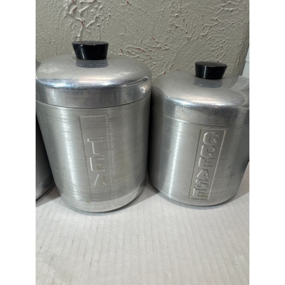Vintage MCM Spun Aluminum Canister Set Flour Sugar Coffee Tea Lids Black Grease