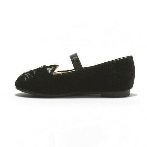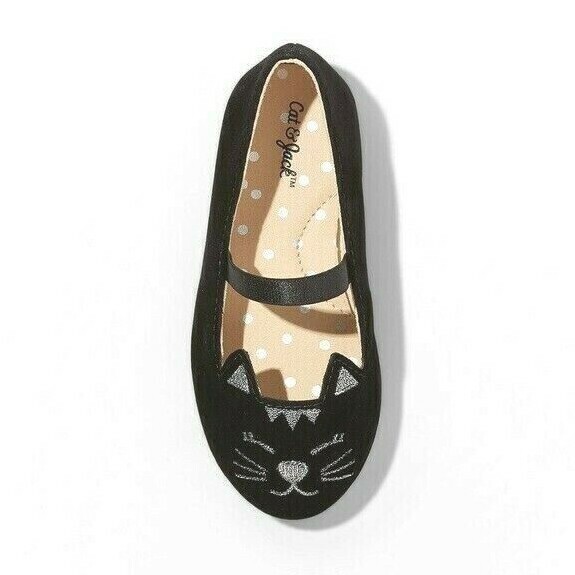 This is for a brand new with tags pair of Toddler Girls' Macey American Girl Black Silver Kitty Ballet Flats Cat Jack Toddler girls' black ballet flats with kitty accents for an adorably cute look Elastic strap across the top creates a secure fit Slip-on style makes for easy on and off