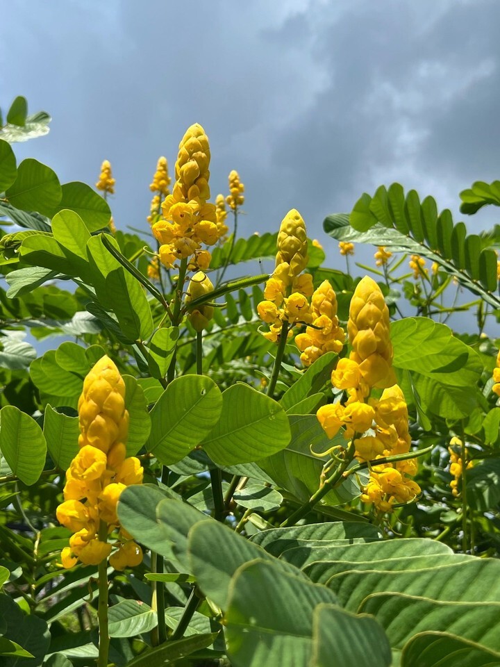 Senna alata, commonly known as the Candle Bush or Candelabra Bush, is a fast-growing, tropical shrub native to the Americas and widely cultivated in tropical and subtropical regions. Belonging to the Leguminosae family, it is renowned for its bright yellow, candle-like flower spikes that rise above its lush, pinnate green foliage, creating a dramatic and ornamental display. Typically growing 6 to 12 feet tall, Senna alata thrives in full sun and well-drained soils, and it is moderately drought-tolerant once established. The shrub attracts a variety of pollinators, including bees and butterflies, making it a valuable addition to wildlife-friendly gardens. While fast-growing and low-maintenance, Senna alata may require occasional pruning to maintain shape and encourage flowering. Its combination of vibrant blooms, lush foliage, and ecological benefits makes it a popular choice for tropical landscaping and medicinal gardens.