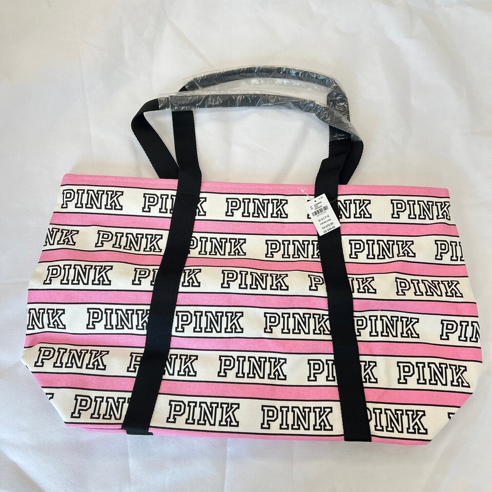 Victoria's Secret Pink Tote Weekender Bag Pink Black Logo Stripe Canvas