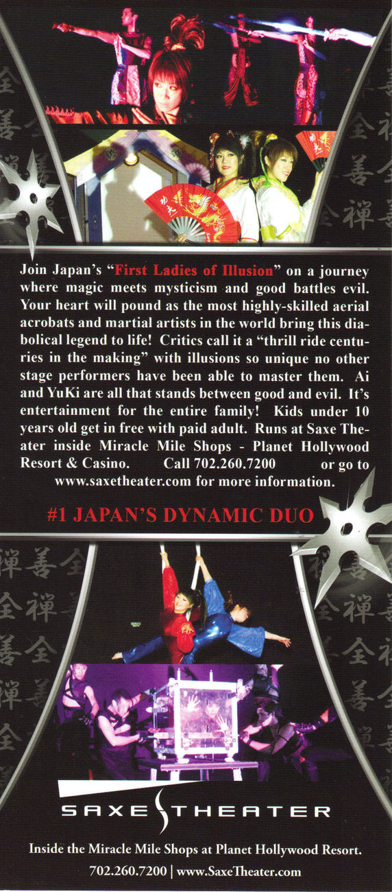 This is promo card for ZEN MAGIC: LOVE COURAGE MAGIC The Ariel Acrobat Show which began August 11th 2010 at the Saxe Theater in the Miracle Mile Shops at Planet Hollywood, Las Vegas, Nevada.