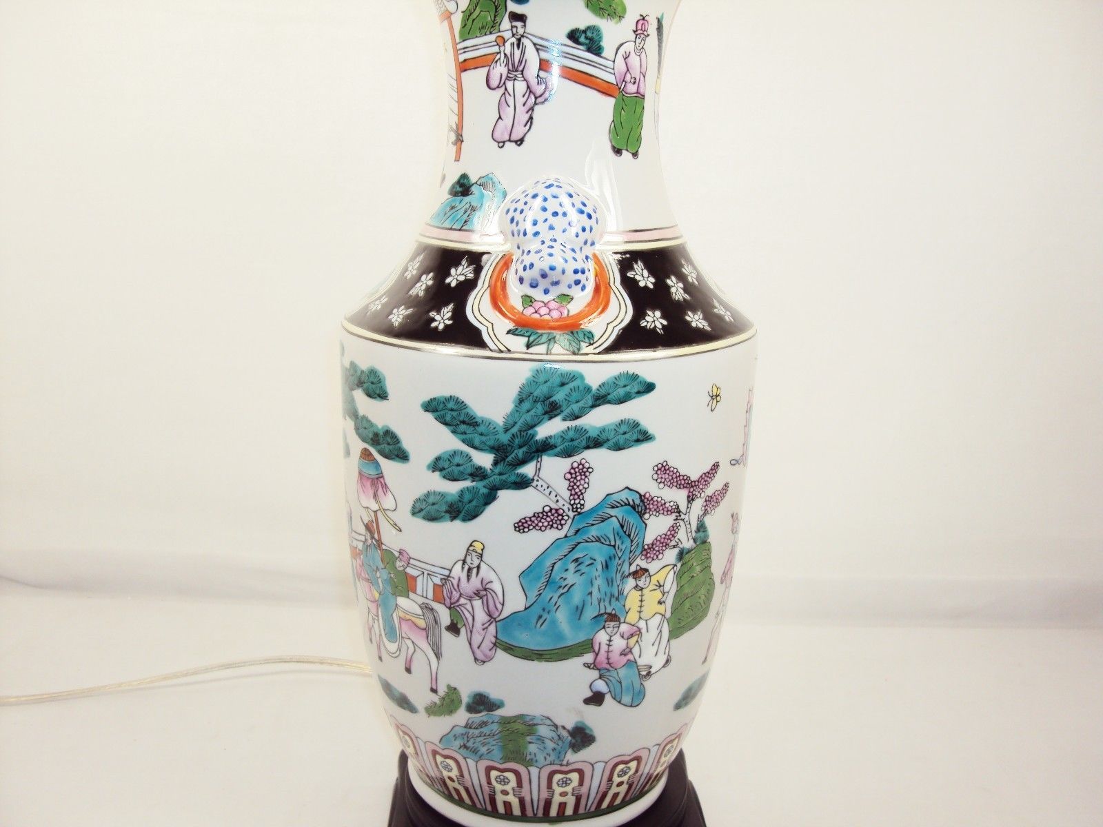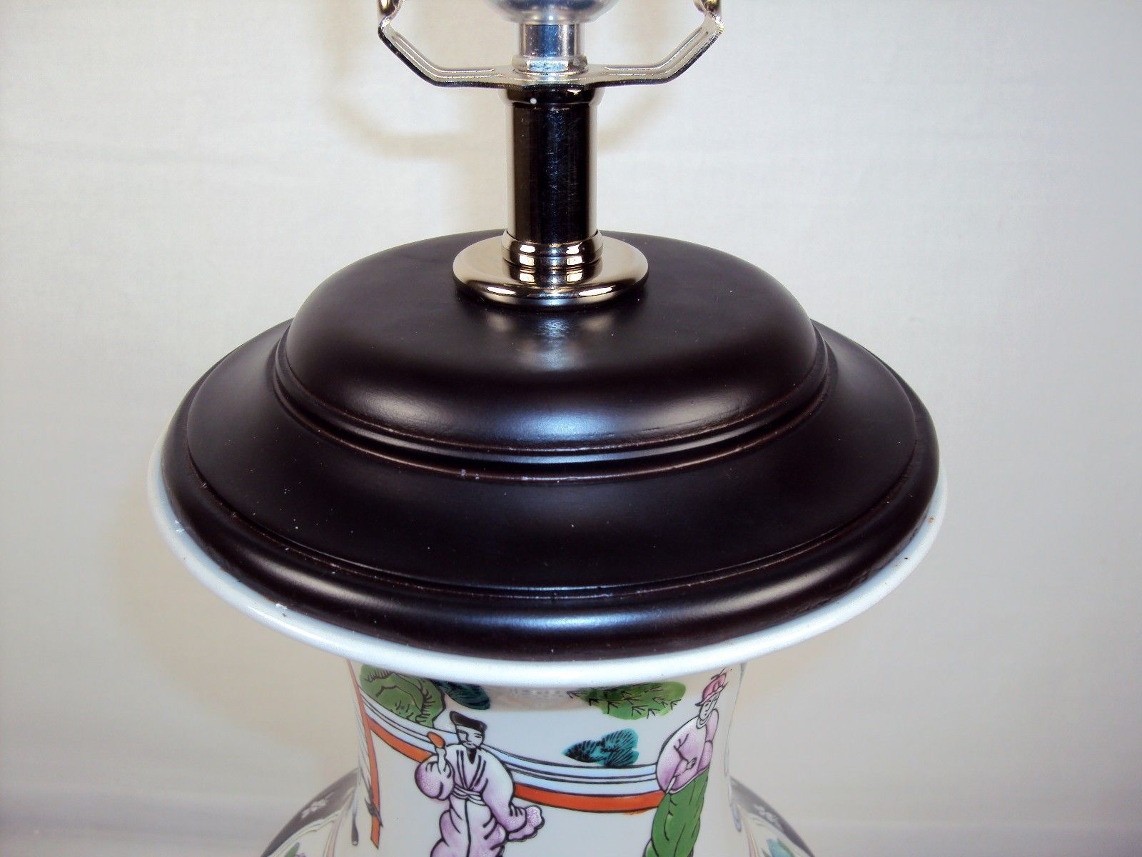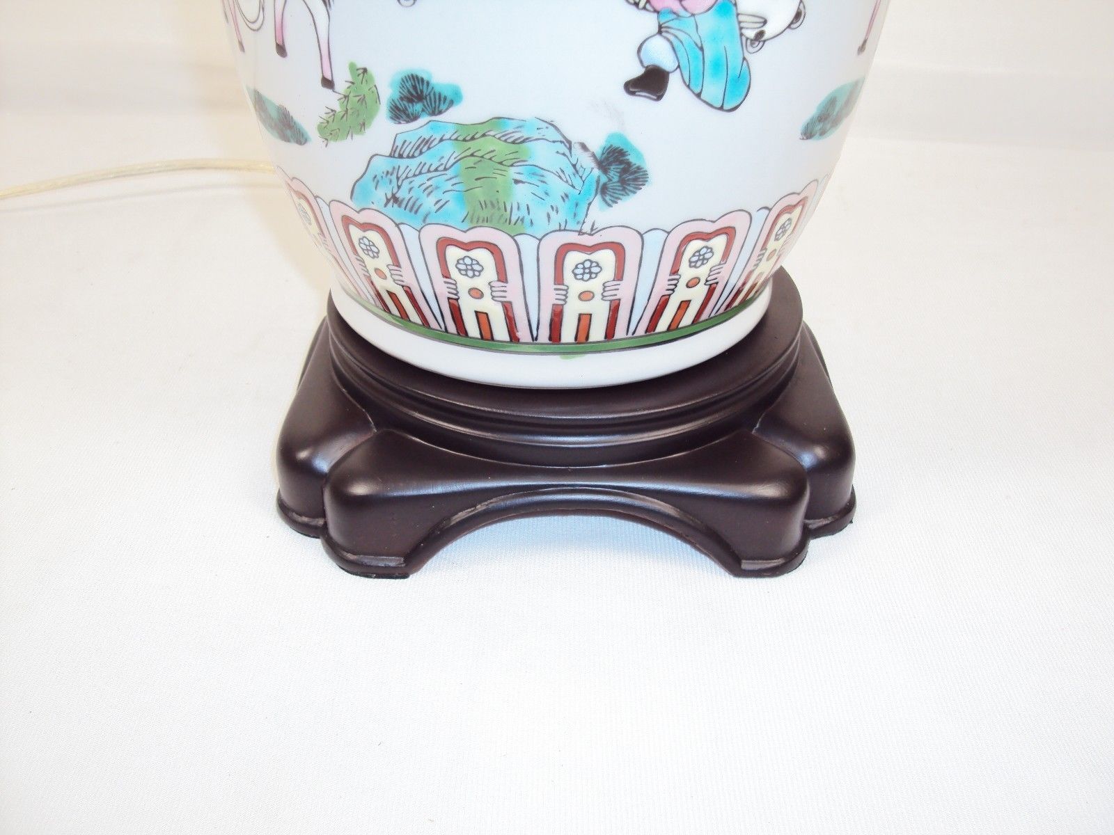 This listing is for a large, beautiful table lamp that features a hand painted scene depicting a Chinese village scene with people and animals engaged in various activities. There are also flowers and trees as well as some raised 3D artwork on the porcelain body which is mounted to a four-footed dark mahogany carved wood base. The bulb socket is made from nickel and mounted in a polished nickel frame. The light is controlled with an on/off rotary style switch located on the side of the bulb socket housing. Although it is designed to serve as a handy hotel bedside light, this beautiful lamp will look great in many other environments, too. Uses a standard base light bulb of up to 150W. The heavy duty cord is a generous 8' long and UL rated to ensure safe operation. Overall dimensions of the lamp, from the top of the finial to bottom of the base = 34", and the base measures 7" x 7". The bare lamp weighs 13 pounds.