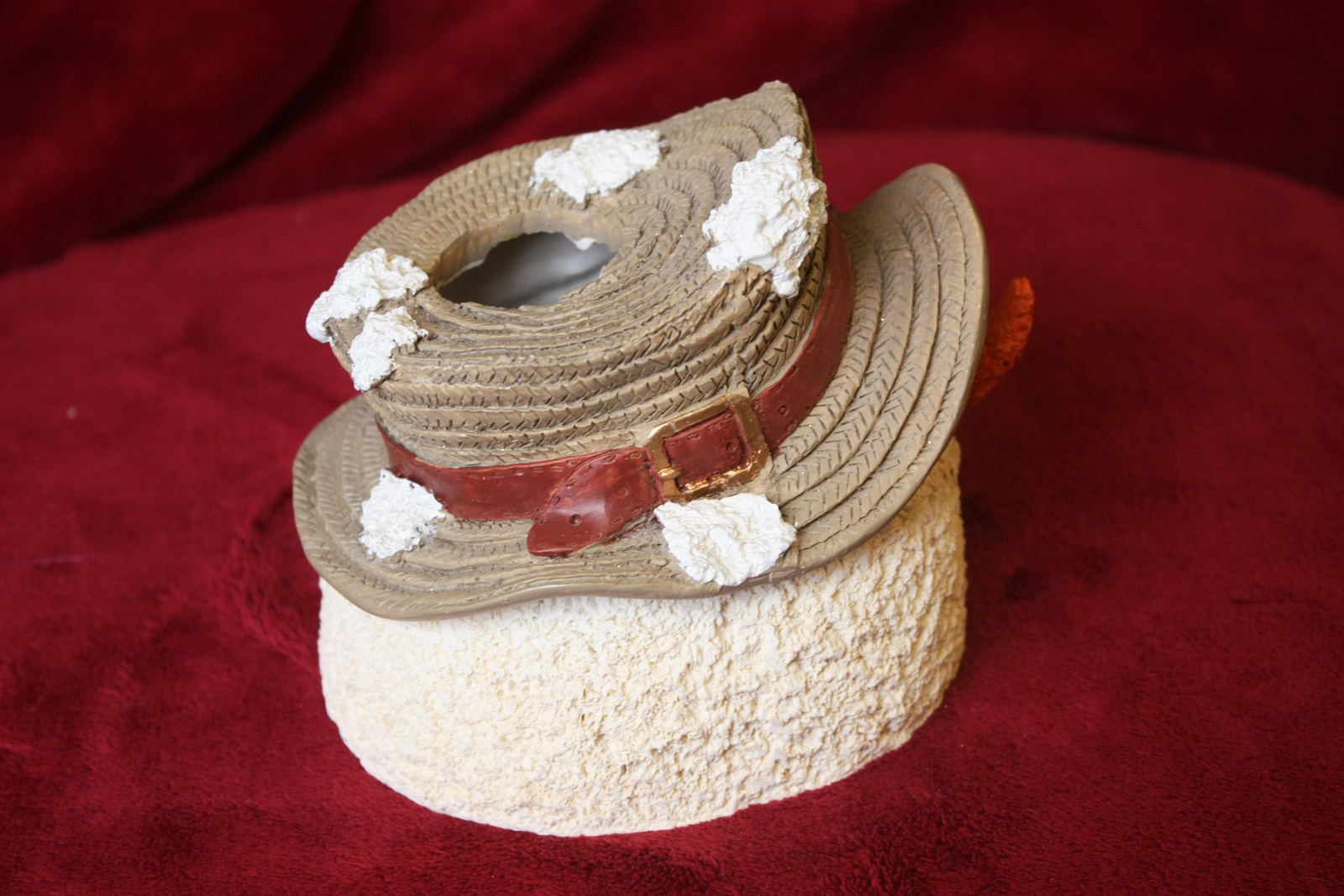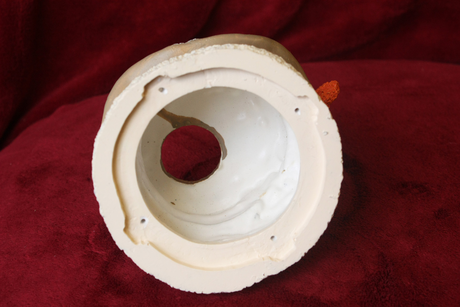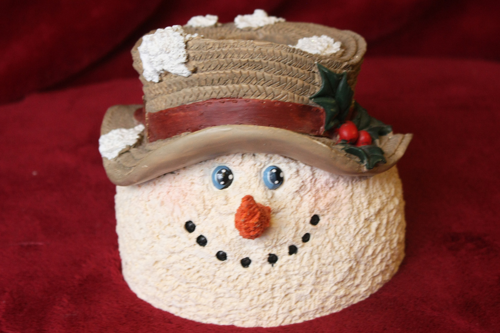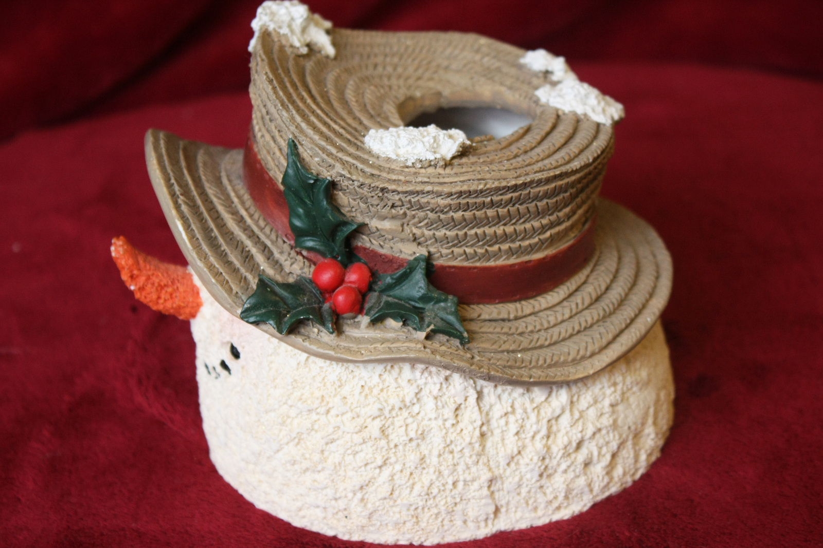 This is a snowman face candle base that is in great condition. The snowman face goes over a thin taper candle as the candle goes through the top of the hat. There is no bottom to the snowman face (it came this way). There are no cracks, chips, or breaks in the snowman face. The face is 5" x 6.75" and the candle width maximum is 1.5".