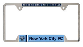 Officially licensed New York City FC metal license plate frame. Decorated with two full color inserts. The cast zinc frame is chrome plated .024 gauge aluminum embossed with two mounting holes on the top of the frame. Standard 6"x12" size. Made in USA.