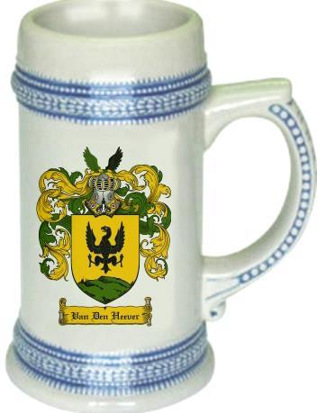 Vandenheever Family Crest Stein / Coat of Arms Beer Tankard. We believe our Coat of Arms Steins are of the highest quality anywhere. The glassware quality is very thick and sturdy. The stein feels great in your hand with a very thick handle. Fill this glass with your favorite beer or beverage. keywords: steins, beer, german, glass, glassware, cup, tankard, goblet, family shields, shield, family, genealogy, heraldry, code of arms