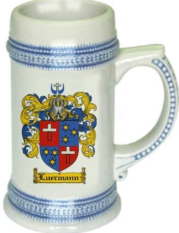 Luermann Family Crest Stein / Coat of Arms Beer Tankard. We believe our Coat of Arms Steins are of the highest quality anywhere. The glassware quality is very thick and sturdy. The stein feels great in your hand with a very thick handle. Fill this glass with your favorite beer or beverage. keywords: steins, beer, german, glass, glassware, cup, tankard, goblet, family shields, shield, family, genealogy, heraldry, code of arms