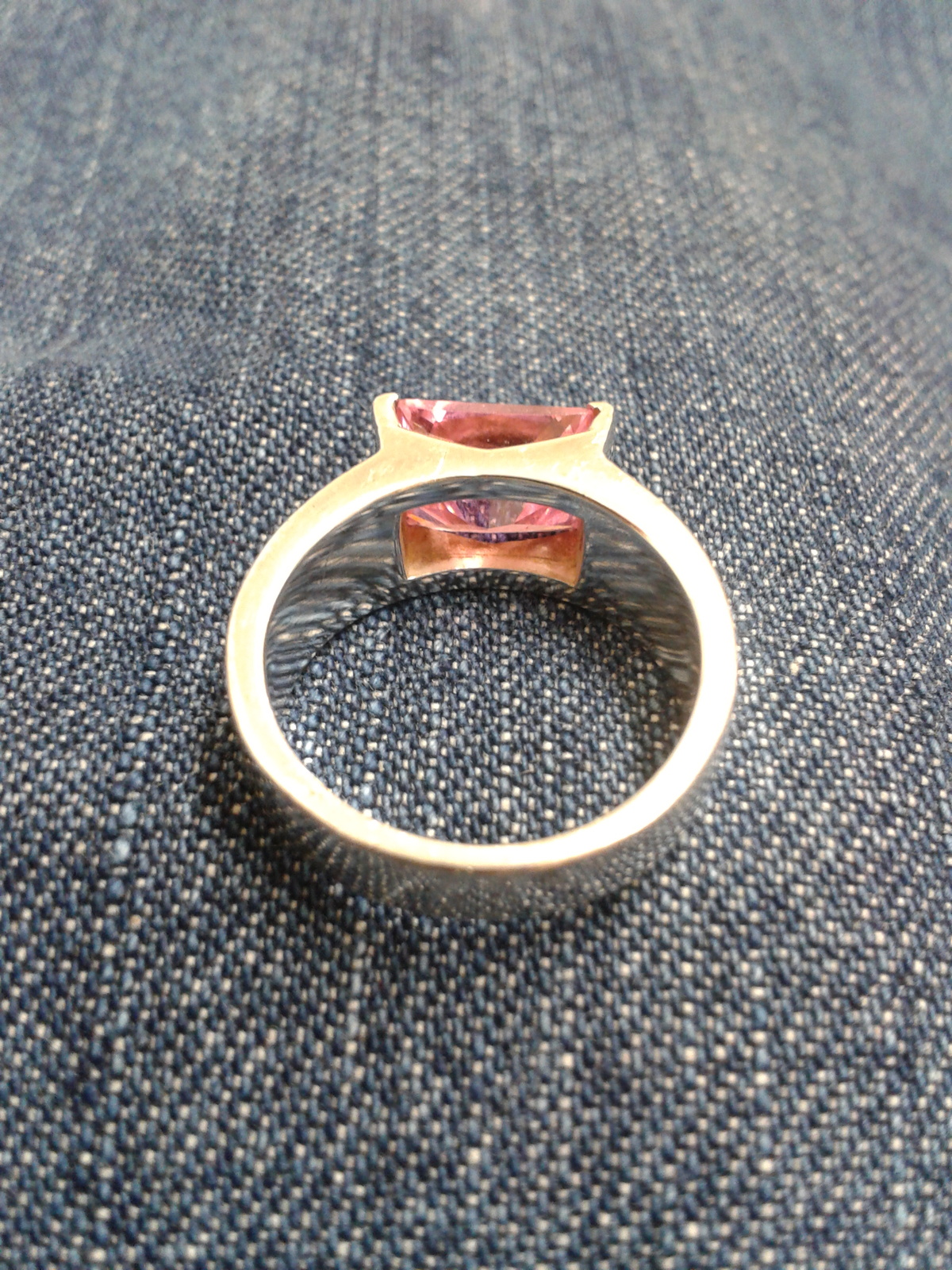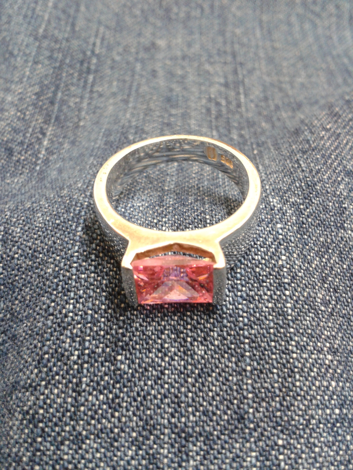 A beautiful solid sterling silver ring set with square brilliant pink CZ stone.