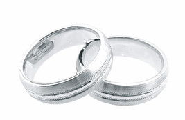 14k white gold his and her wide wedding band sets have a flat body with a matte center. One thick, shiny, diamond cut line runs through the center of the band surrounded by milgrain. Smooth and silky comfort fit finish off this elegant look. Available in any size. Comes with a free gift box.