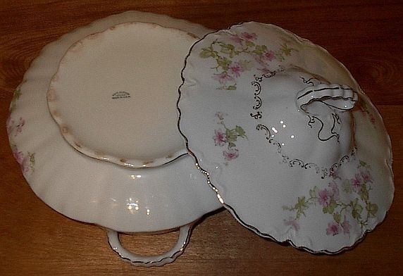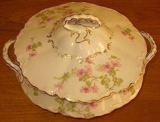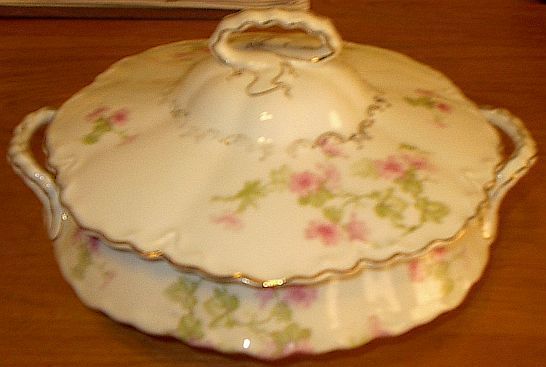 Item: Pope Gosser, USA made covered Tureen. The tureen is 9.5 inches across handle edge to handle edge. The pattern looks like single pink roses. There is a mark on the bottom, Pope Gosser China, Made in USA.