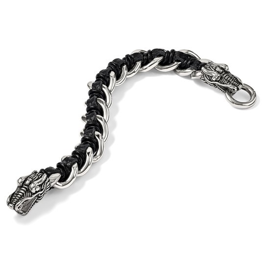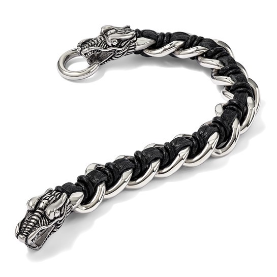 This stylish, sleek and sophisticated Stainless Steel bracelet will be a guaranteed favorite for your jewelry collection. The polished stainless steel finish accentuates the black leather and creates a high-end jewelry vibe. The curb links are constructed with a combination of polished stainless steel with a antiqued finish dragon head. The easy-to-wear folding push clasp completes the look with a secure and comfortable fit.