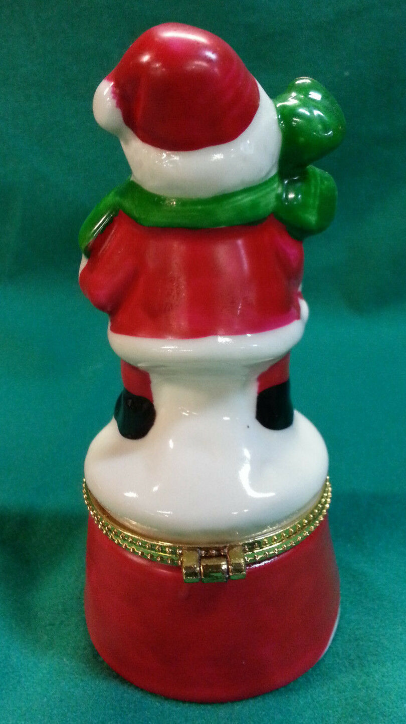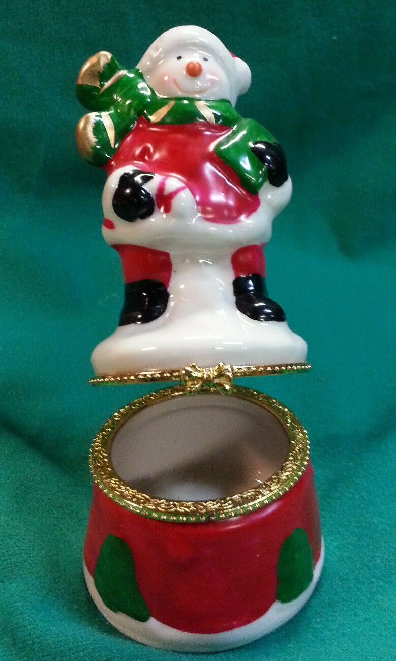 CERAMIC HAND PAINTED SNOWMAN IN SANTA SUIT TRINKET BOX CHRISTMAS DECORATION