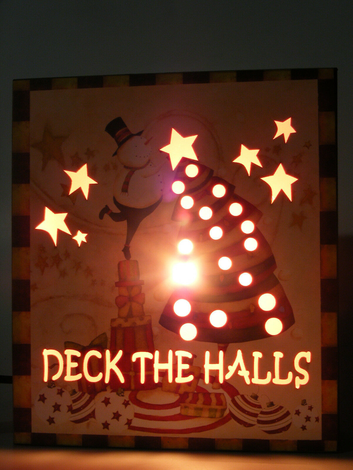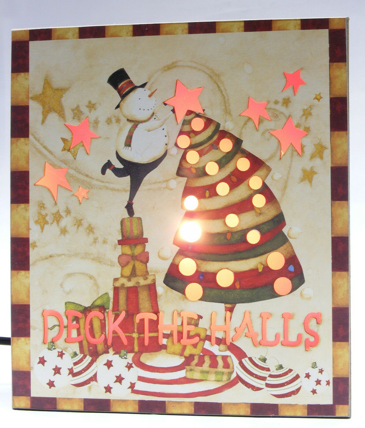 Wood Light Box with a Jolly Snowman Decorating a Christmas Tree Standing on Presents! Star Ornament Cutouts Light Up on Tree. "Deck The Halls" Cut Out at Bottom of Tree.