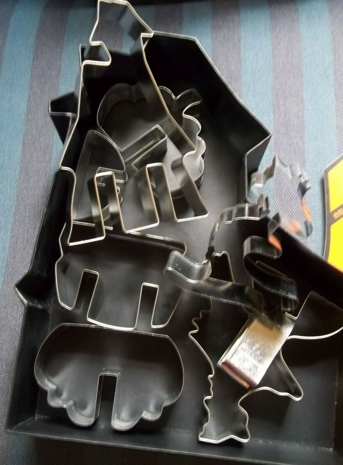 Packed in a haunted house shaped box 8 pieces are haunted house, pumpkin, cat and witch and the bases to make them stand