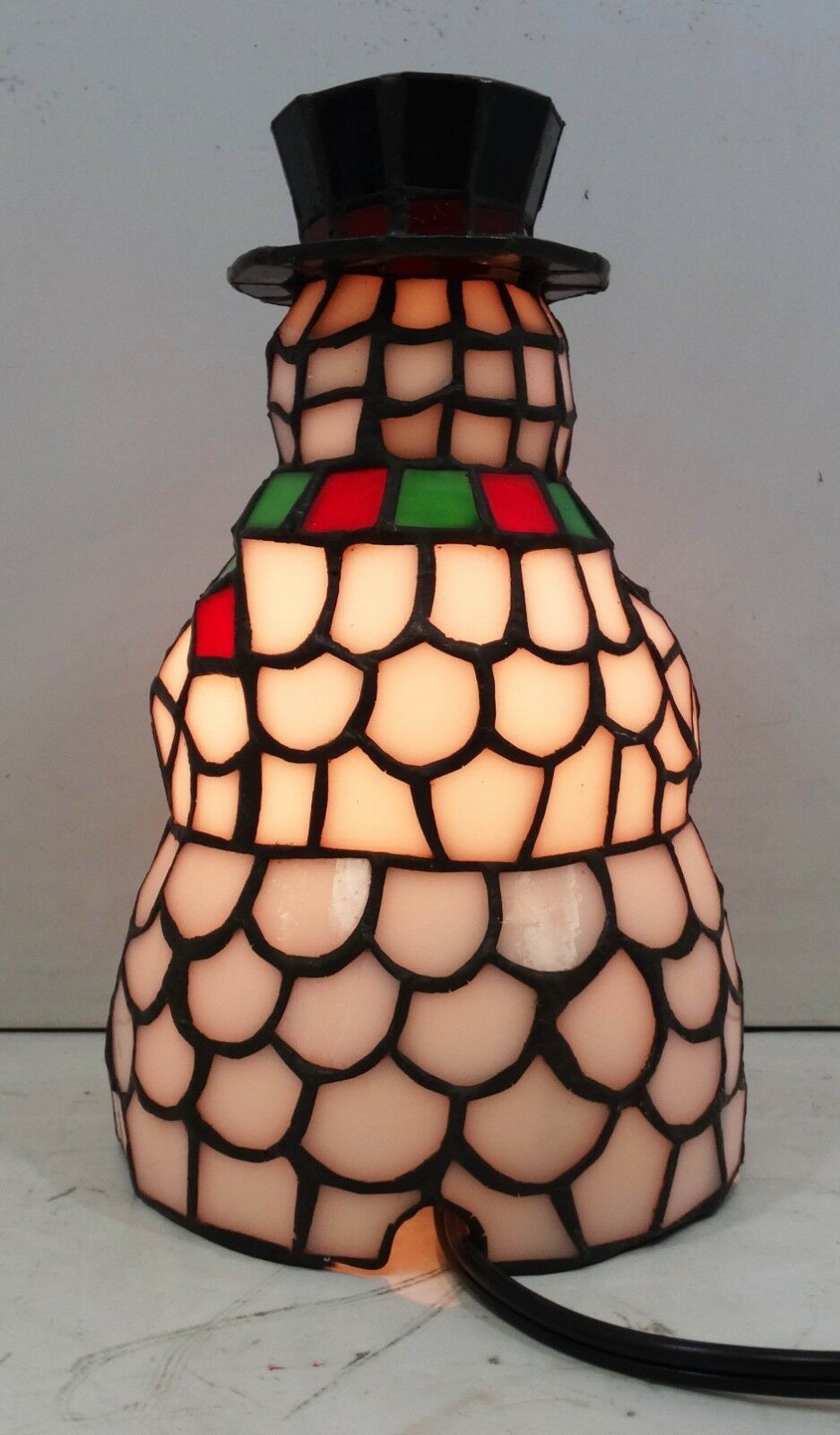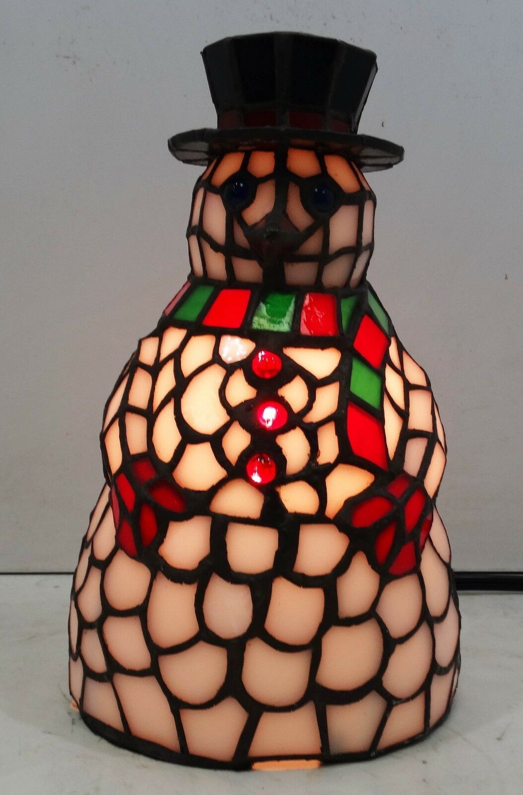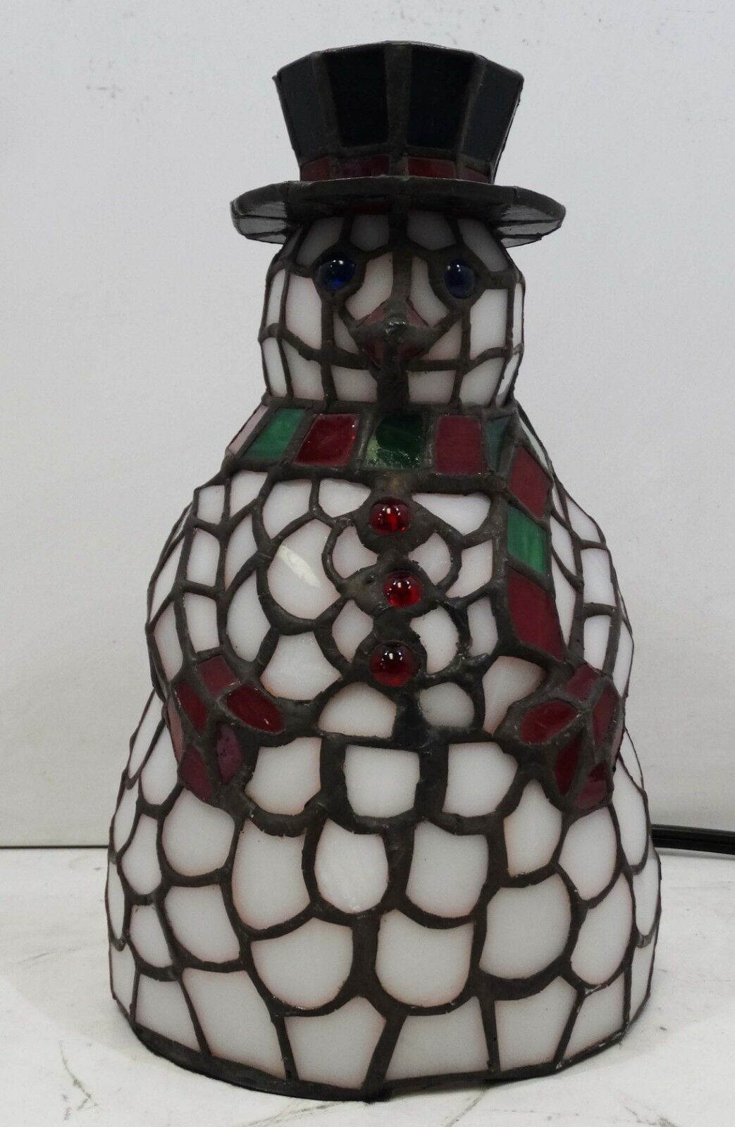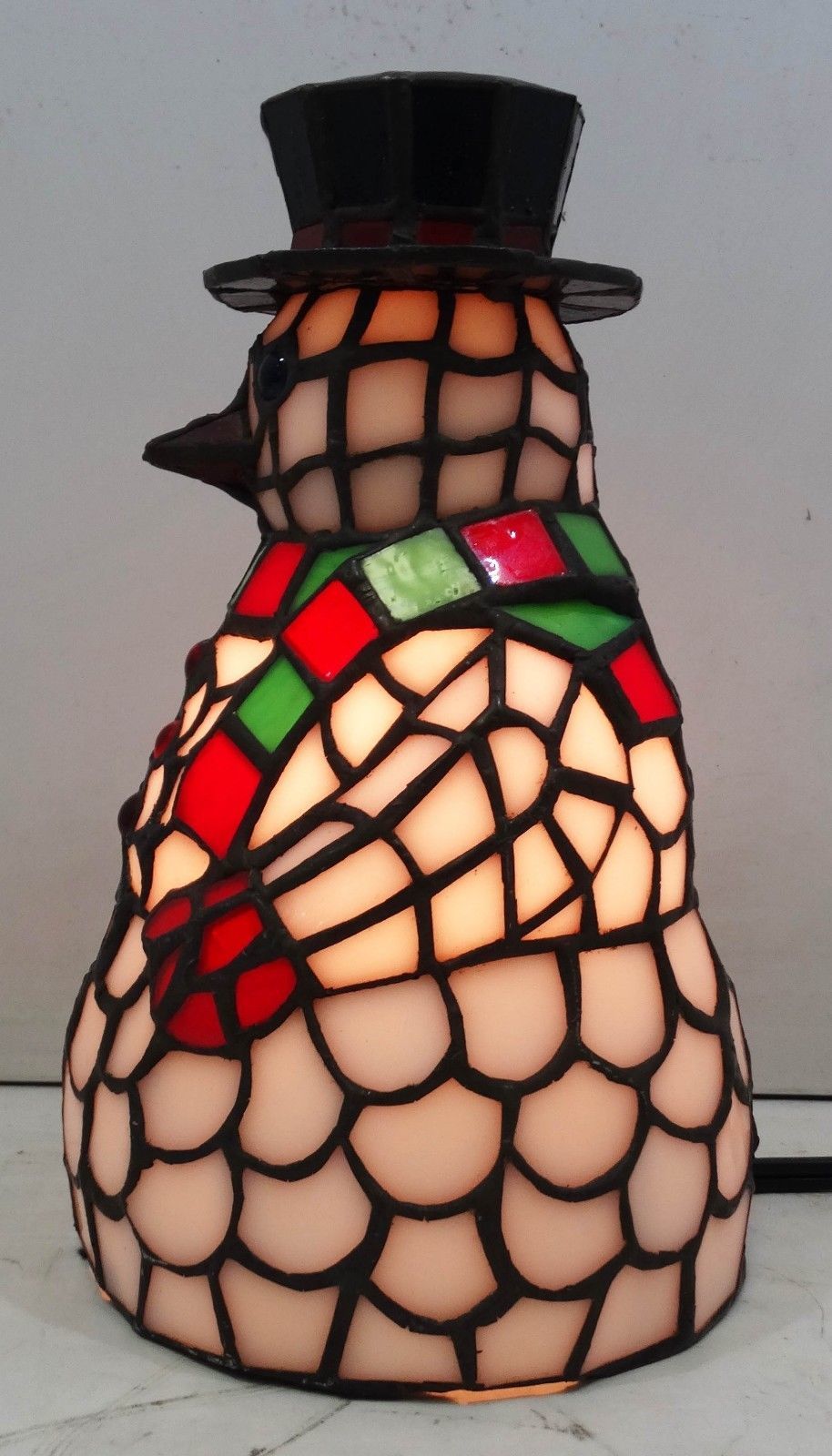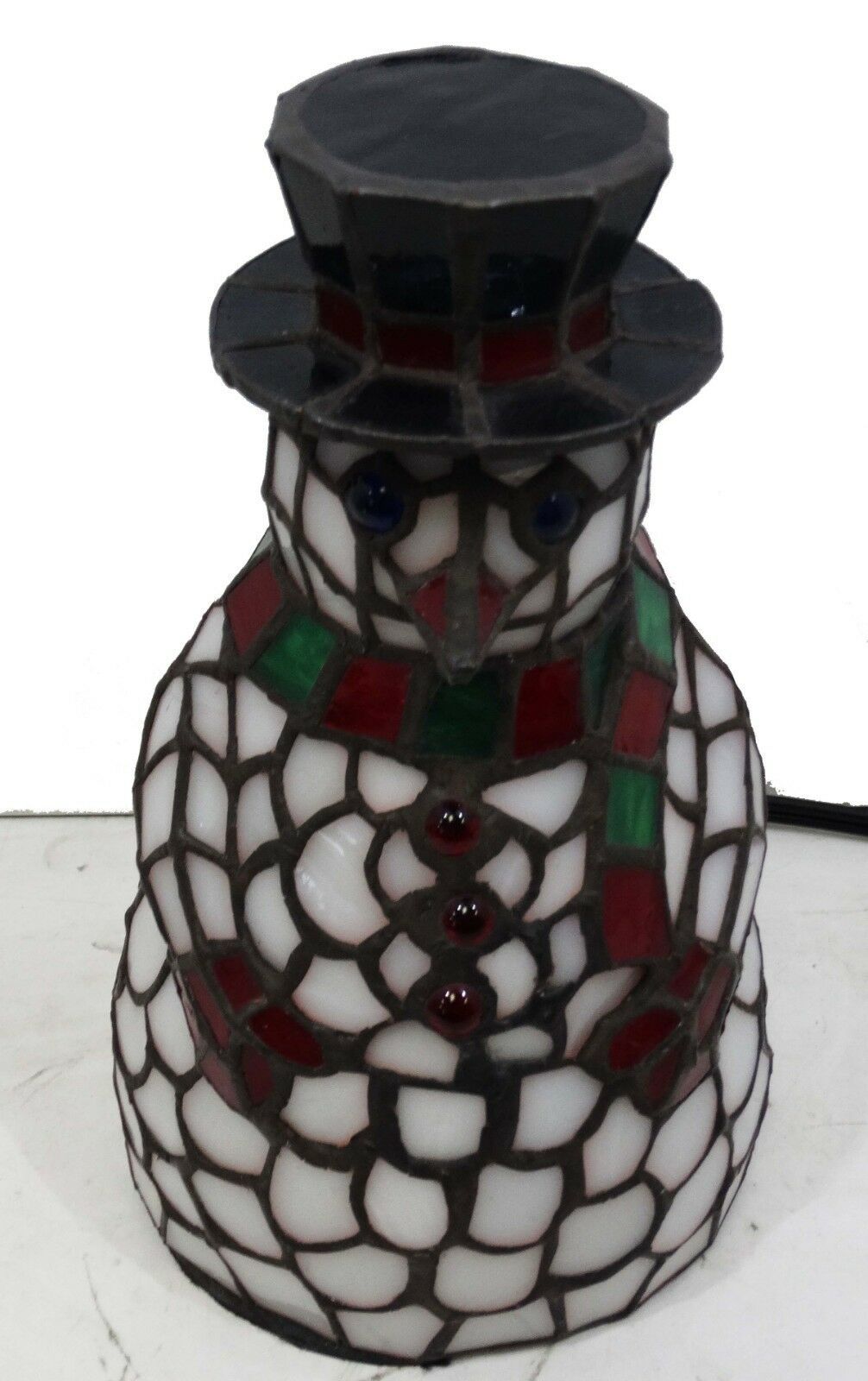 This cheerful Snowman accent lamp, crafted of Winter White with Berry Red and Pine Green stained art glass and colorful jewel accents will take the chill out of the coldest of days.