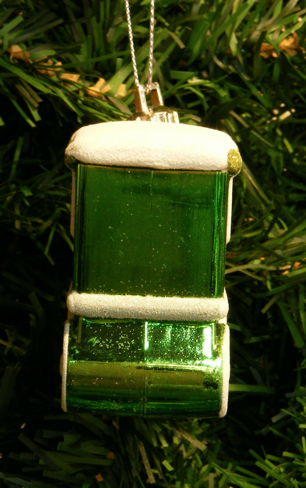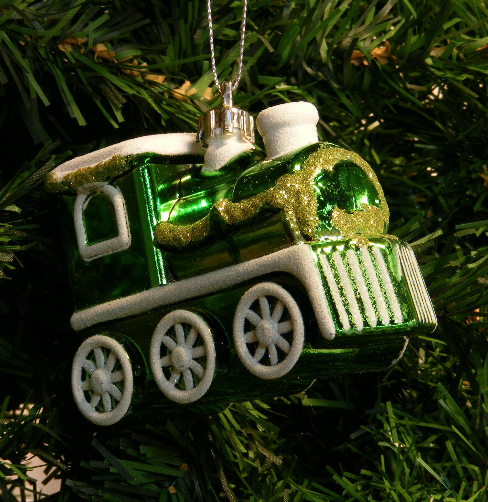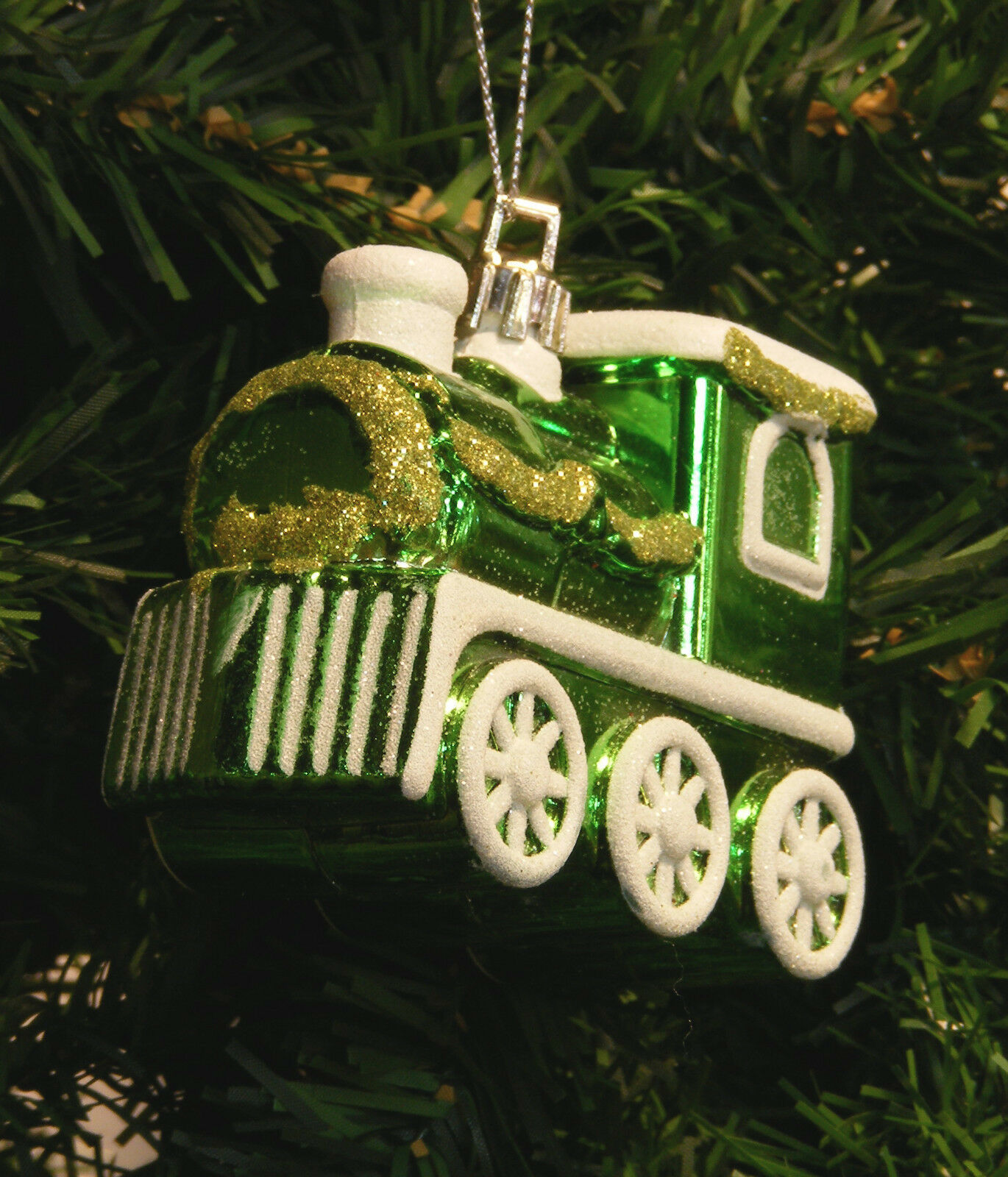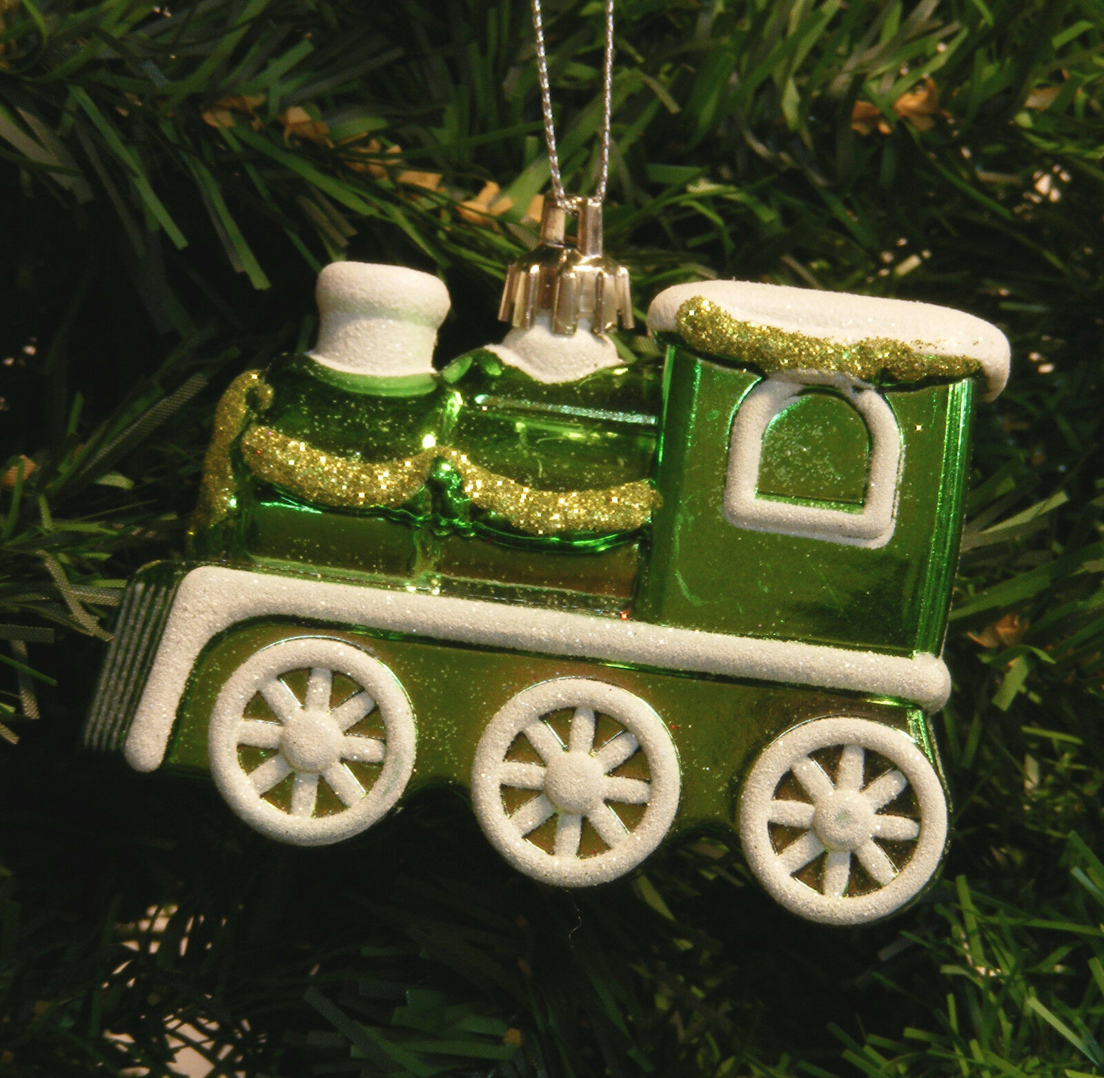 SHATTERPROOF GREEN LOCOMOTIVE TRAIN w/ GLITTER CHRISTMAS TREE ORNAMENT