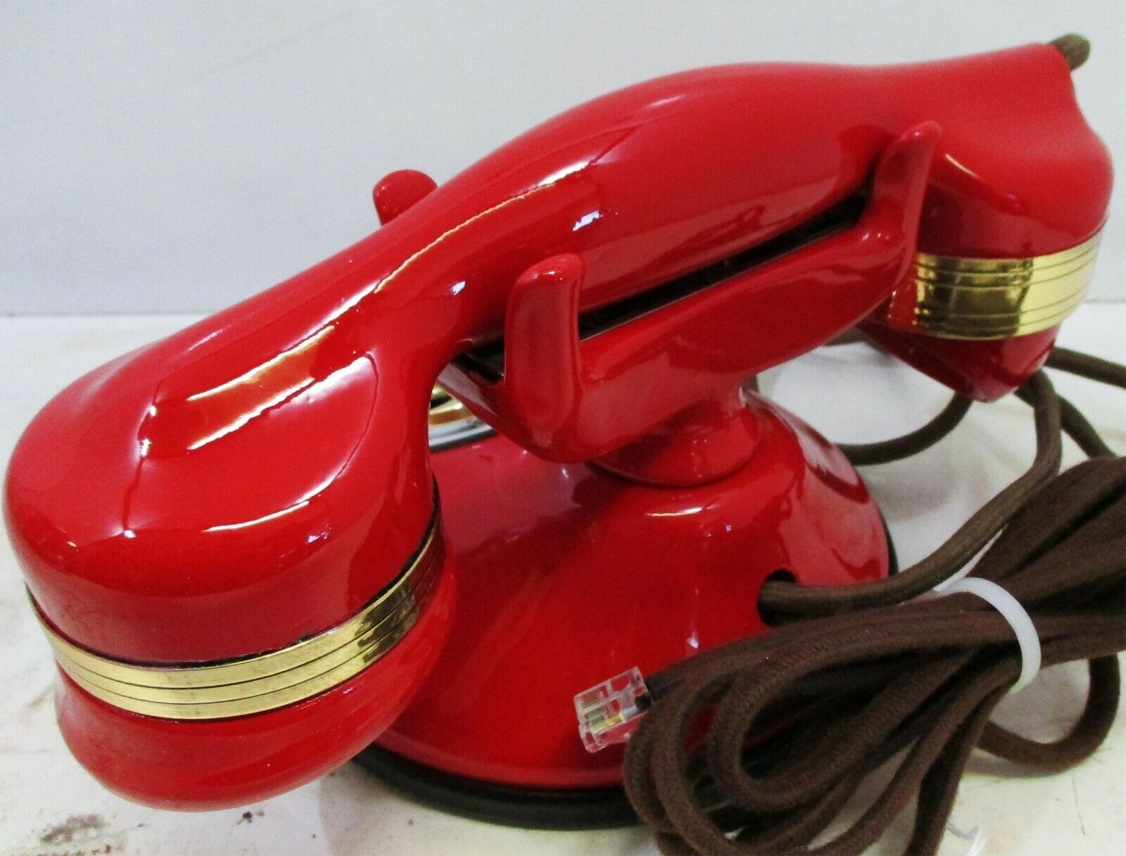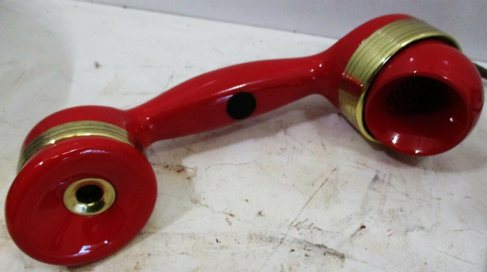 Features a brass rotary dial, bakelite base handset , brass trim, cloth covered cords, unique red finish and fully operational.